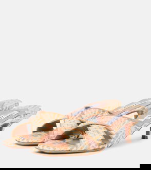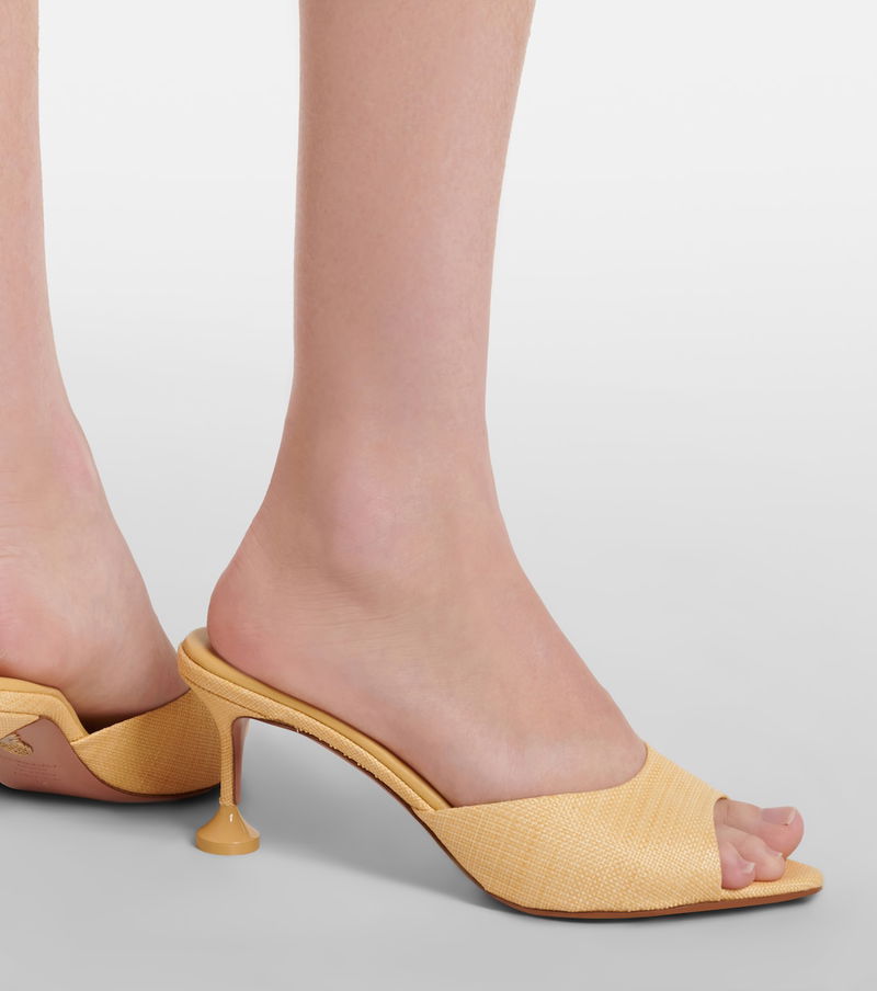 A single pair of Aquazzura shoes can include over 30 components, each of which is hand-assembled by skilled artisans. The Bisous mules are crafted from woven raffia, showcasing pointed toes and flared heels.