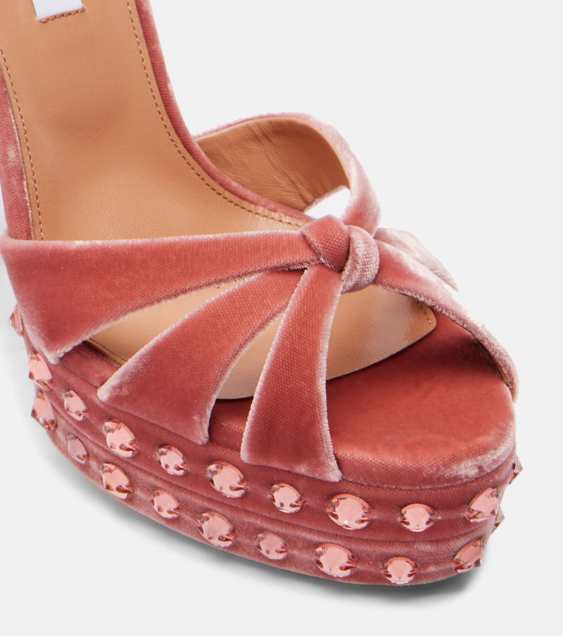 A single Aquazzura pair can include over 30 components, each of which is hand-assembled by skilled artisans. Crafted from velvet, the Cosmic Love platform sandals feature 130mm heels, ankle buckle straps, and pink-hued studs.