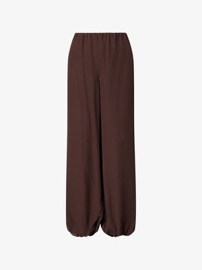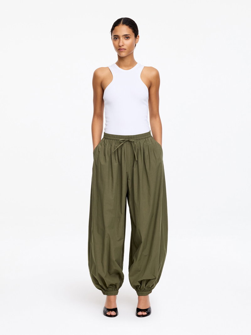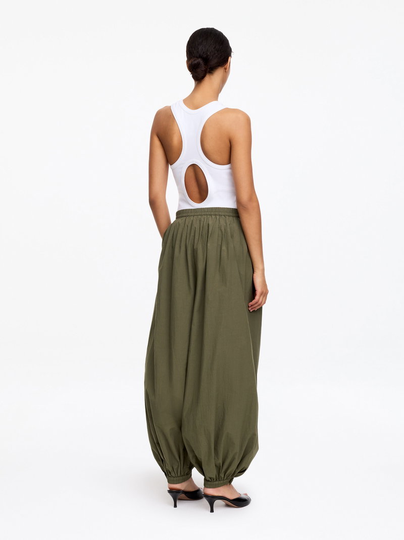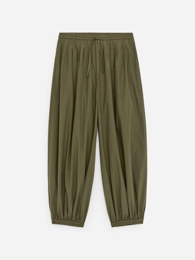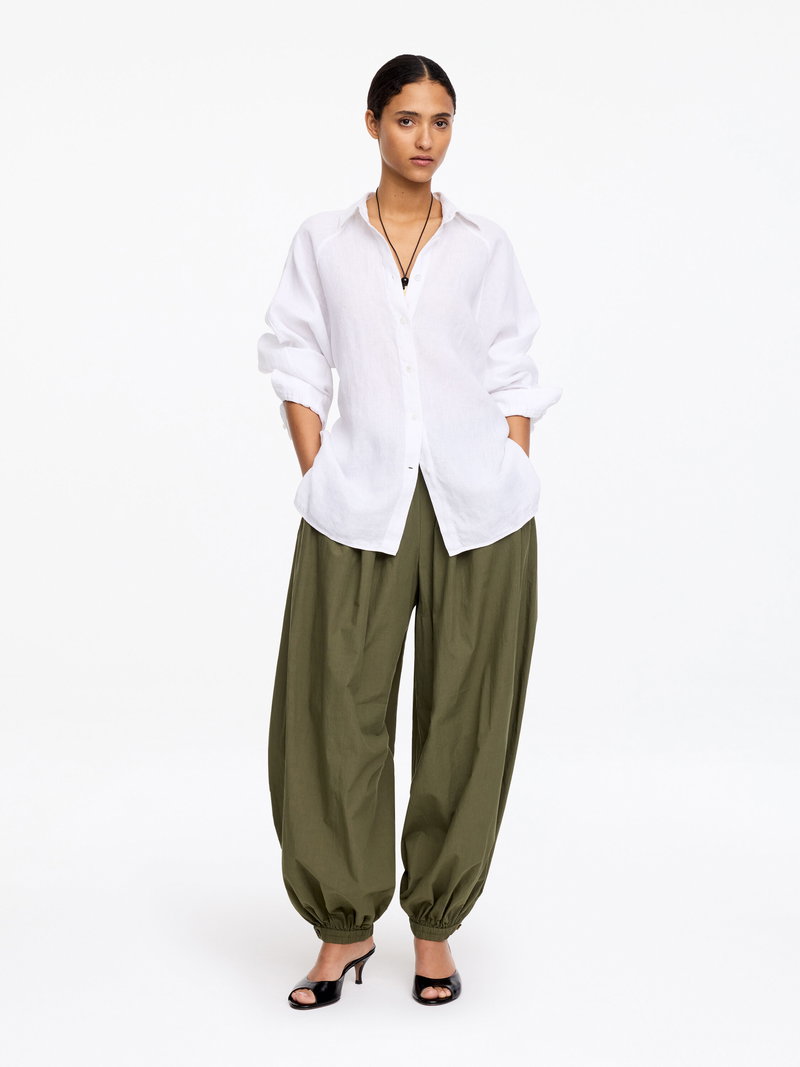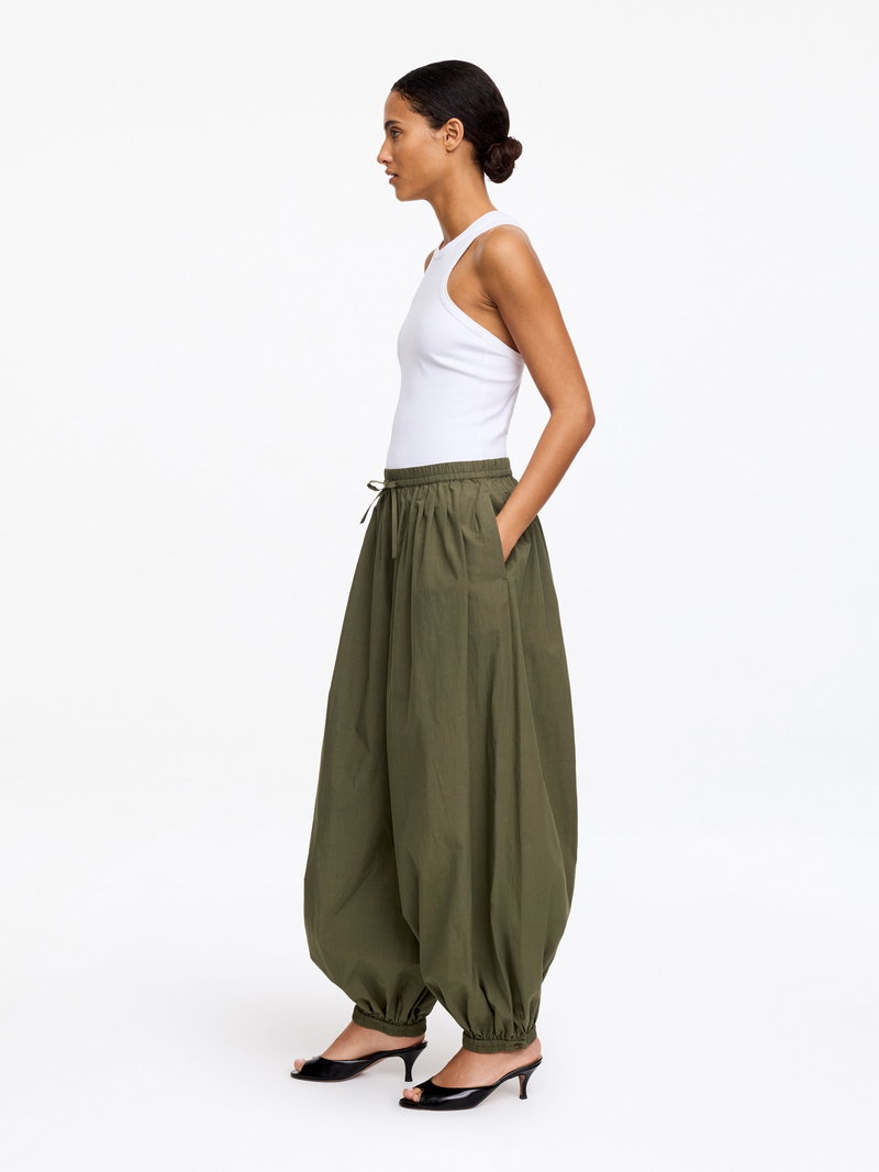 Unlined trousers with a balloon silhouette, crafted from crisp cotton poplin. Designed with an elasticated waistband, featuring a delicate drawstring and soft gathers that transition into pleats around the waist. Finished with side-seam pockets.