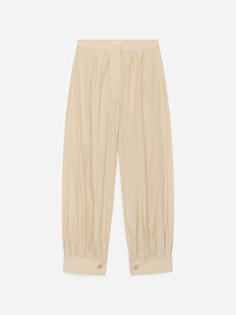 Pleated trousers with a bubble hem. This is an unlined style with a zip fly, hook-and-bar fastening, and buttons at the hem.