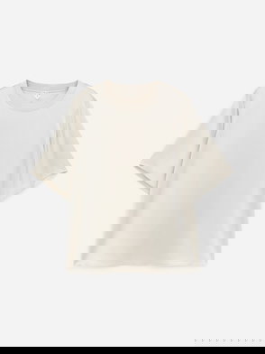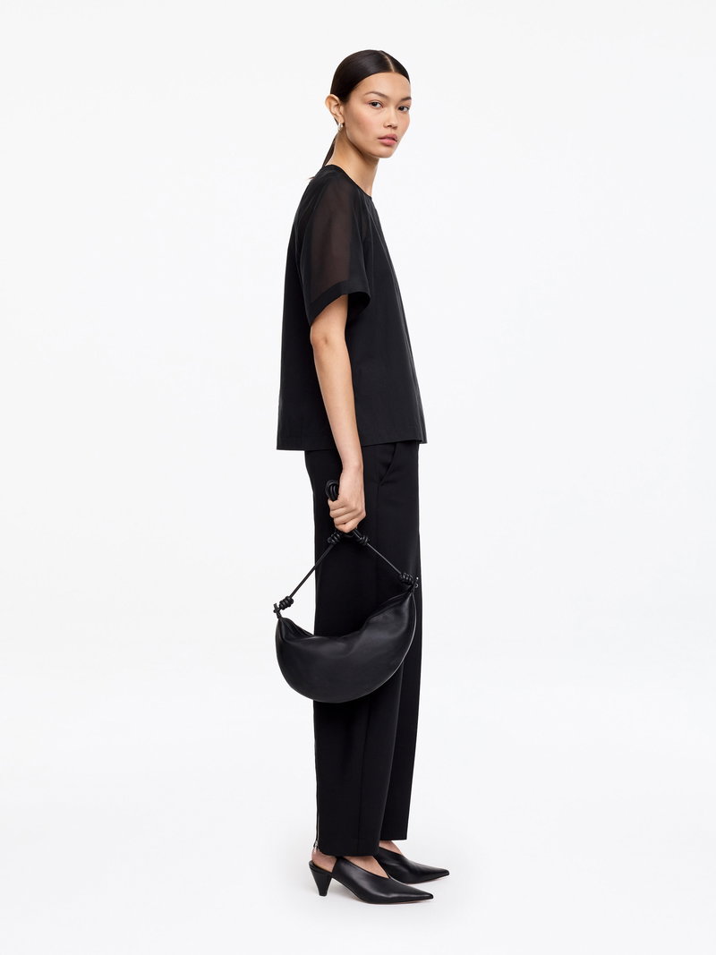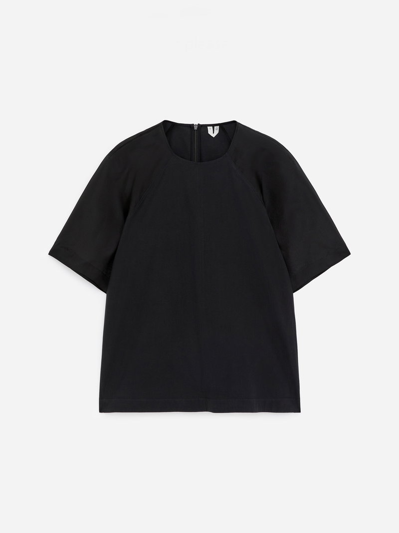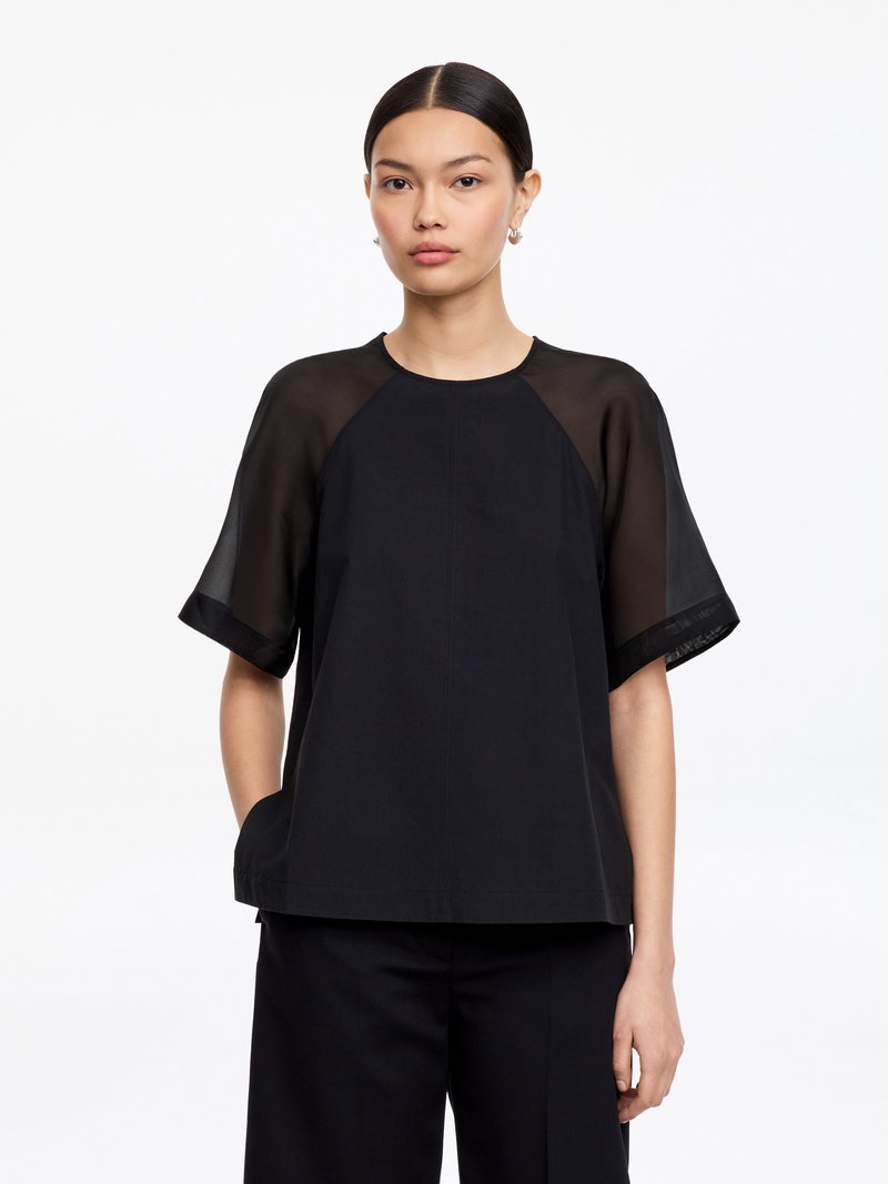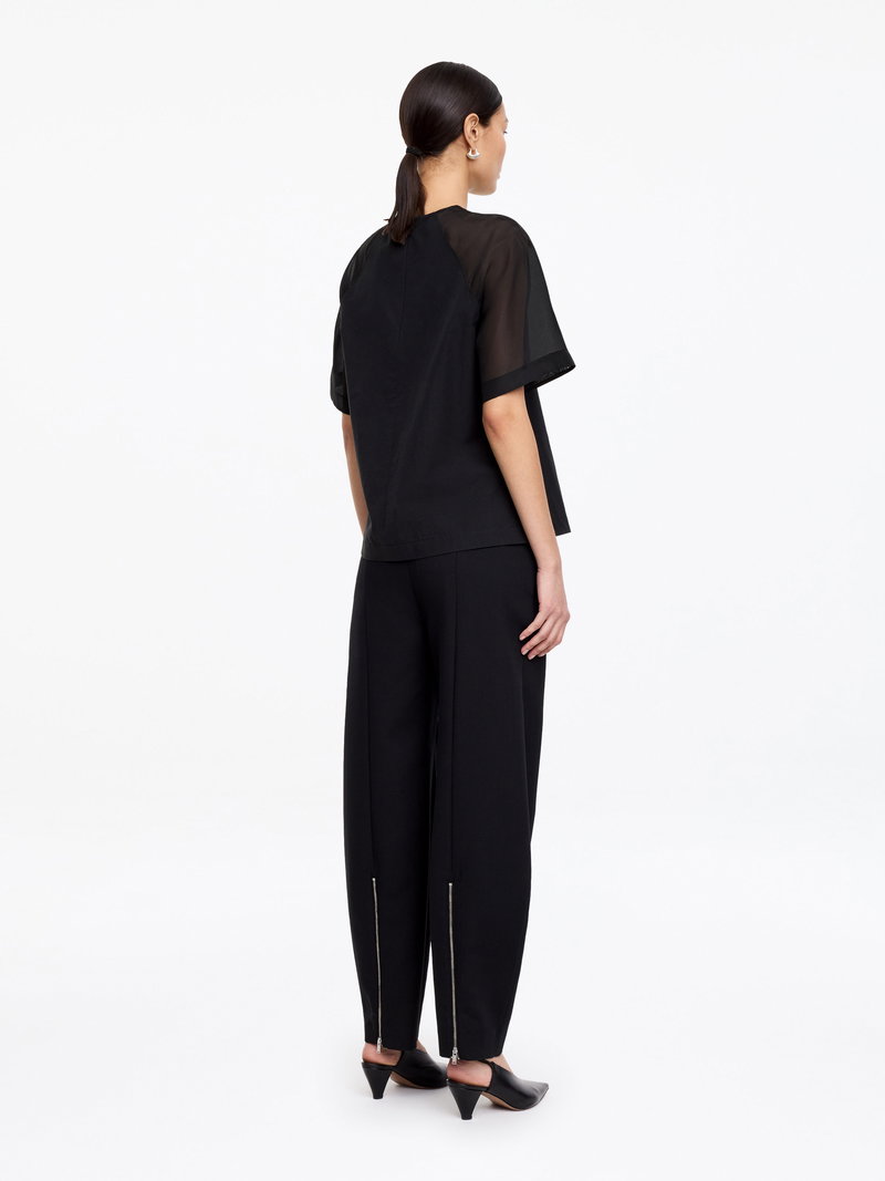 Exploring freedom through movement, this T-shirt reflects a balance of fluidity and strength. Sportswear references are reinterpreted through a relaxed silhouette, combining the comfort of cotton with sheer silk organza sleeves for contrast and lightness. Zip closure at the back.