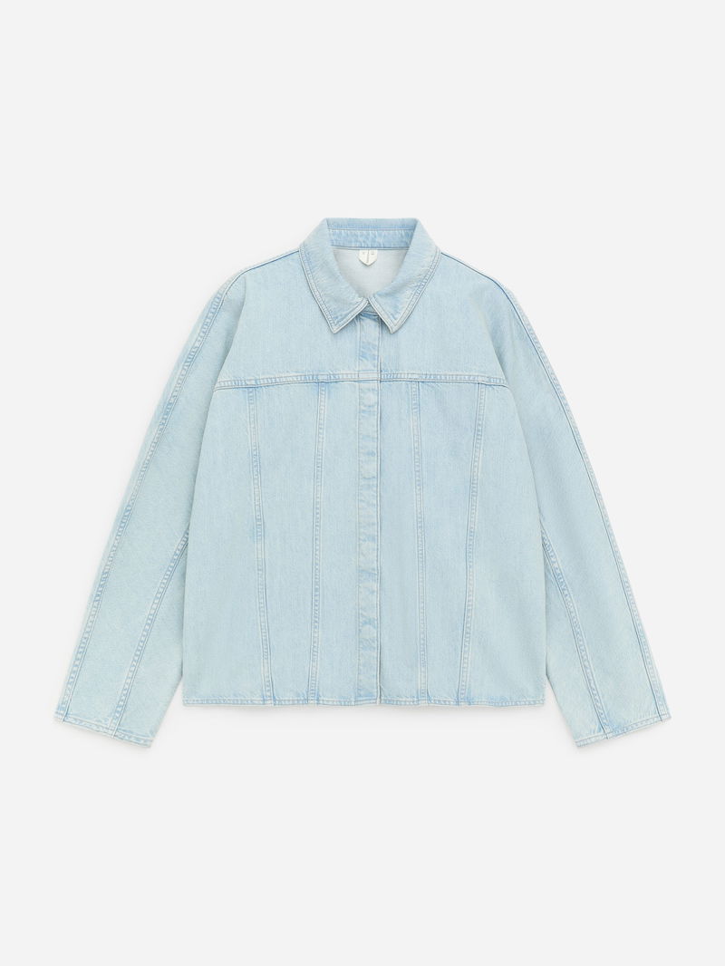 A classic updated with a contemporary silhouette, this denim jacket features a yoke seam across the chest extending into the slightly curved sleeves, alongside vertical wrap seams. Hidden press buttons complete the design.