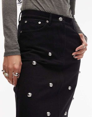 High-waist wrap skirt with asymmetrical hem and button closure.