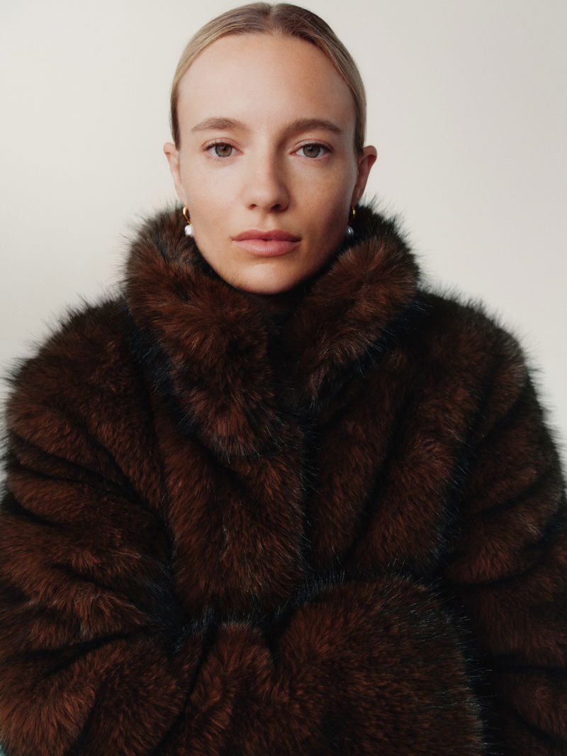 Faux fur jacket with a stand collar and decorative pocket flaps at the front, plus functional side-seam pockets. Fastens with concealed push buttons at the centre front.