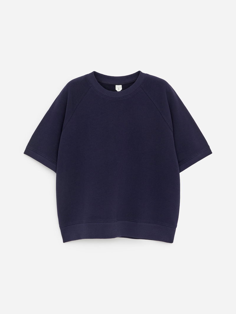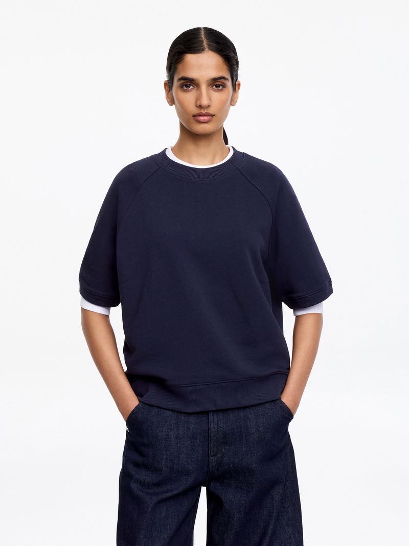 Short-sleeved sweatshirt crafted from cotton with a French terry underside for moisture-wicking properties. A crew-neck style with raglan-cut sleeves and rib-knitted trimmings. Regular fit.