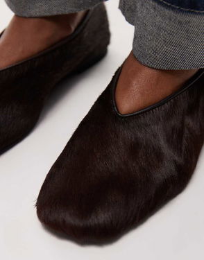 Ballerina flat crafted from cowhide with a textured pony hair-effect finish. Designed with a V-shaped toe.