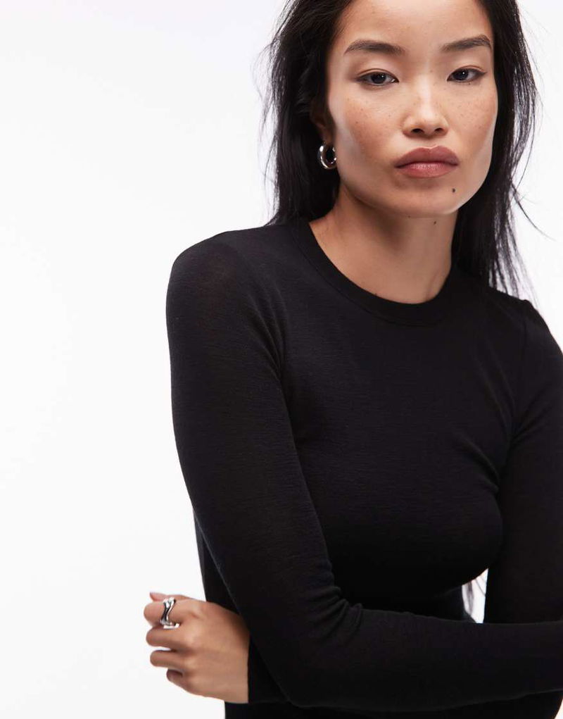 Merino Wool Knit Semi Sheer Long Sleeve Top In Black