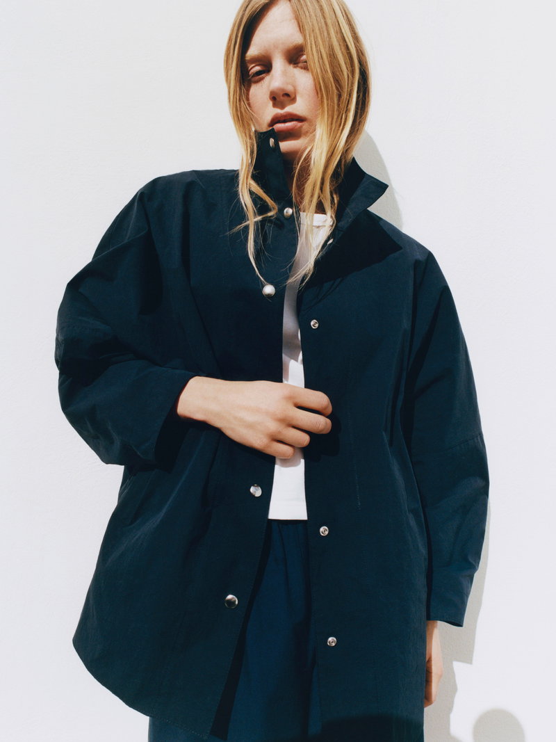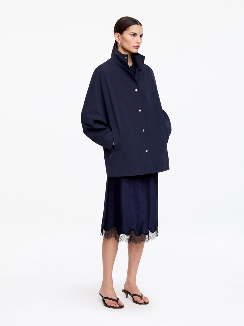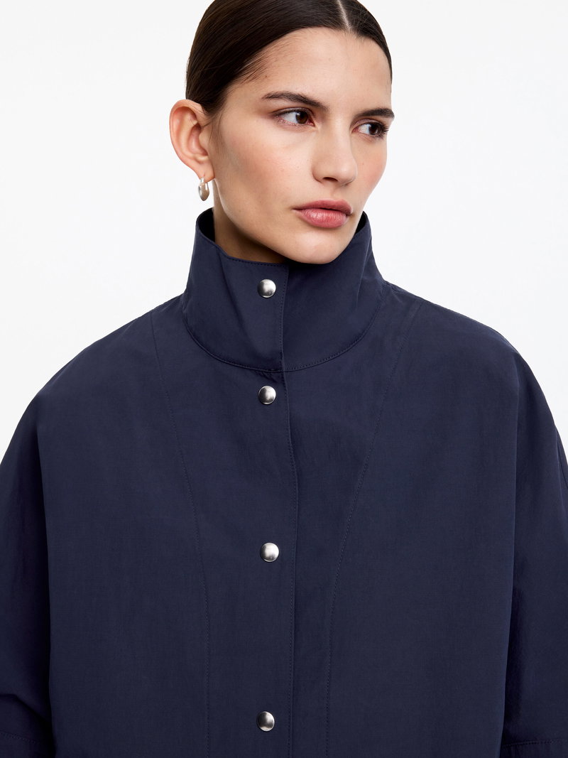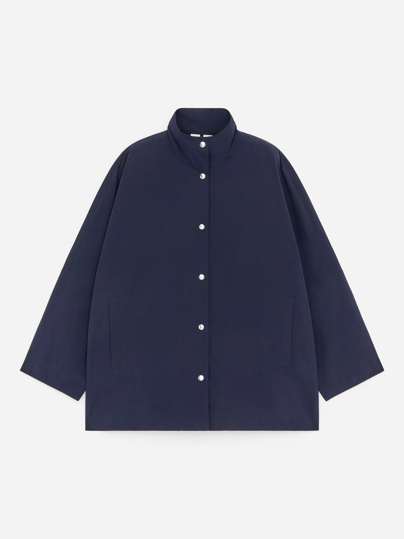 Drawing on sportswear codes recontextualised for ready-to-wear, this oversized shell jacket balances function with a considered everyday expression. The relaxed silhouette is anchored by a stand collar and clean snap-button closures. Fully lined.