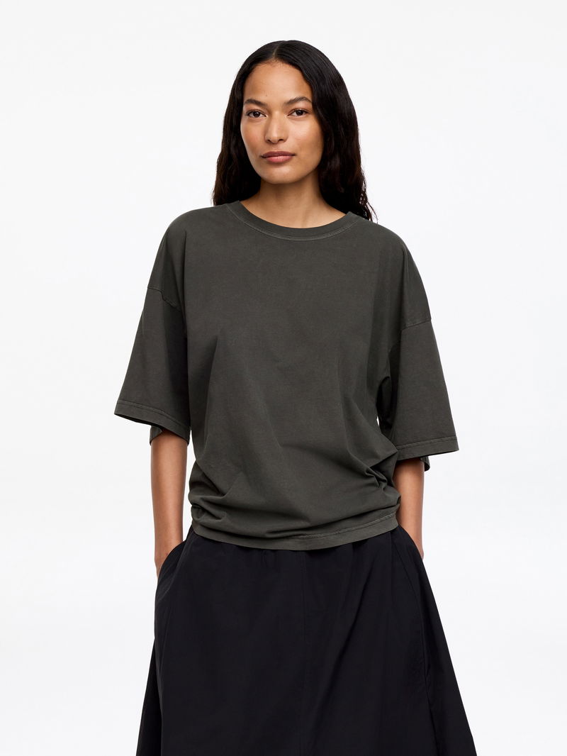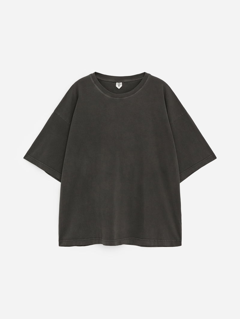 With an oversized silhouette, this T-shirt is an easy starting point for casual dressing. Dropped shoulders and slightly longer short sleeves give it a relaxed proportion. Crafted from midweight cotton, it drapes naturally and feels soft against the skin. Ribbed round neck. 150 GSM.