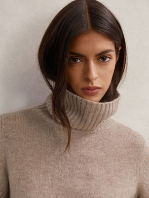 Jumper knitted from pure cashmere. A roll-neck style with a cocoon silhouette and twisted sleeves.