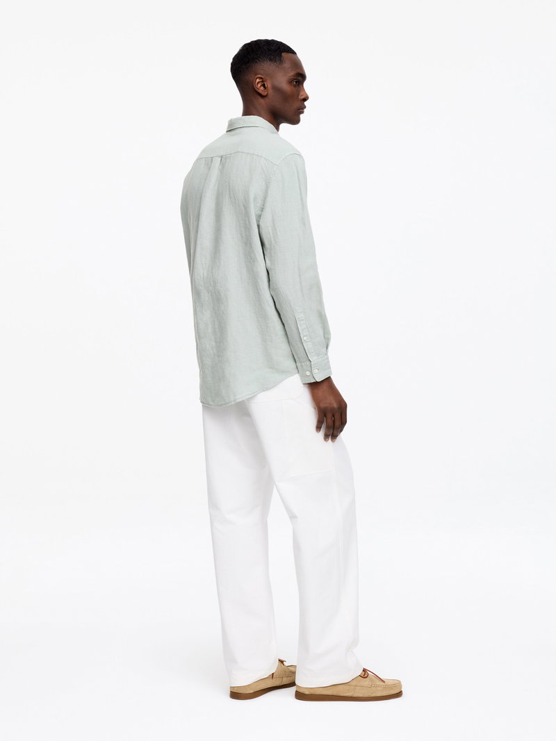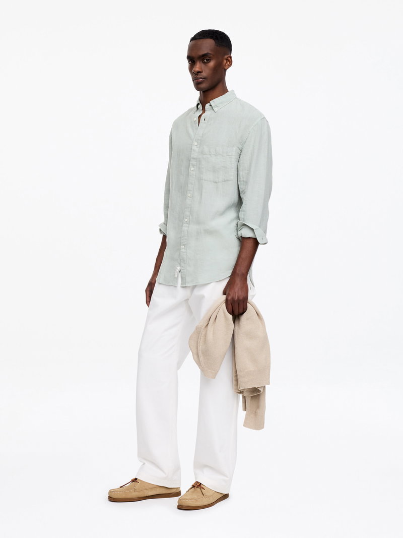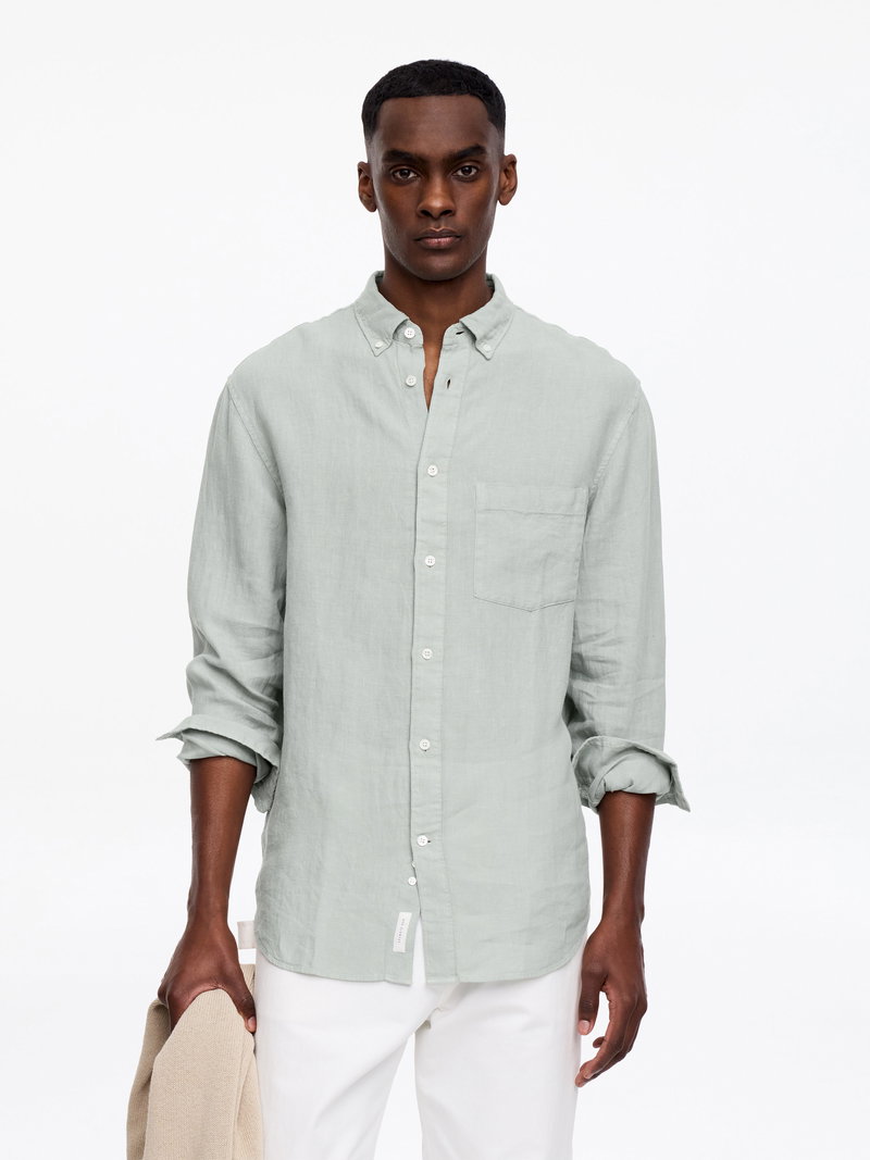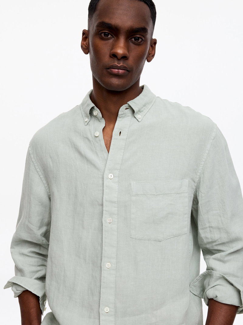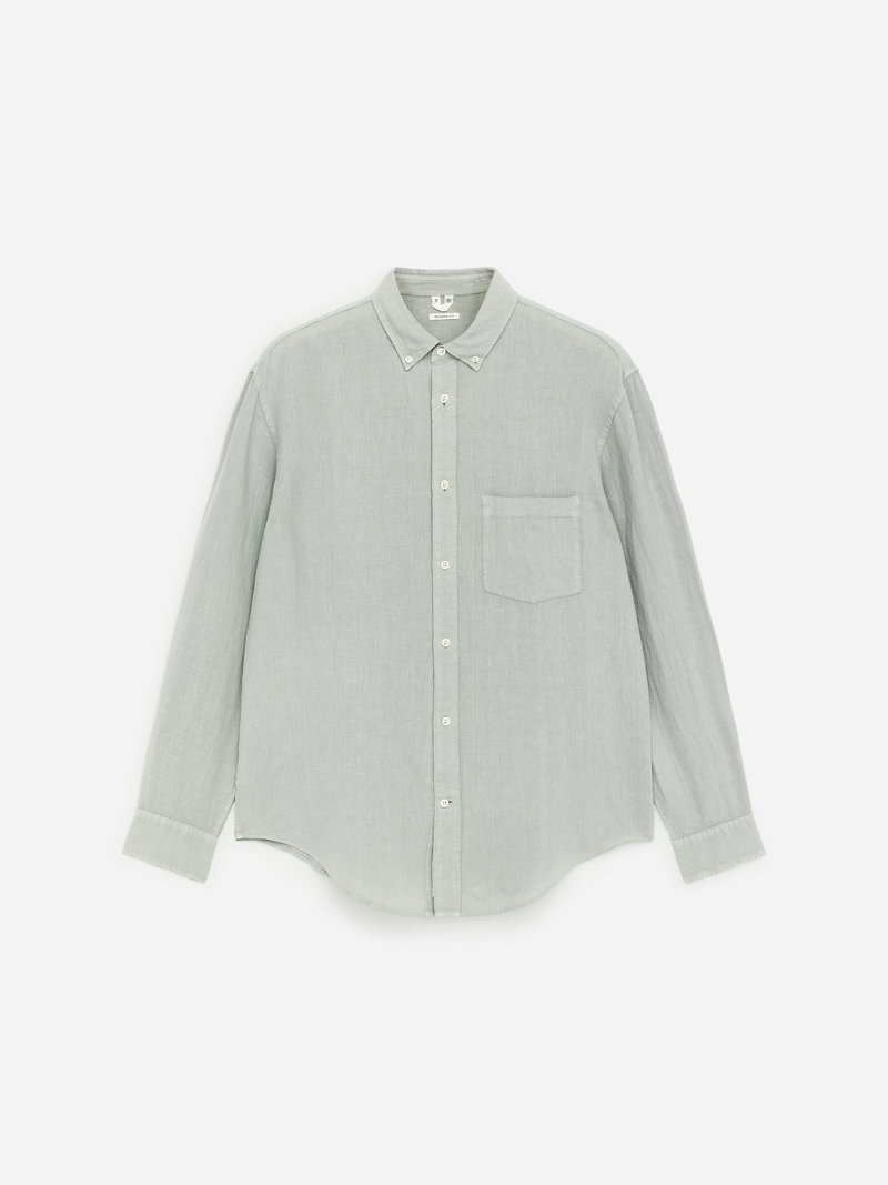 This garment-dyed shirt is crafted from linen and cut for a relaxed fit. Styled with a button-down collar, a single chest pocket and features a curved hemline.