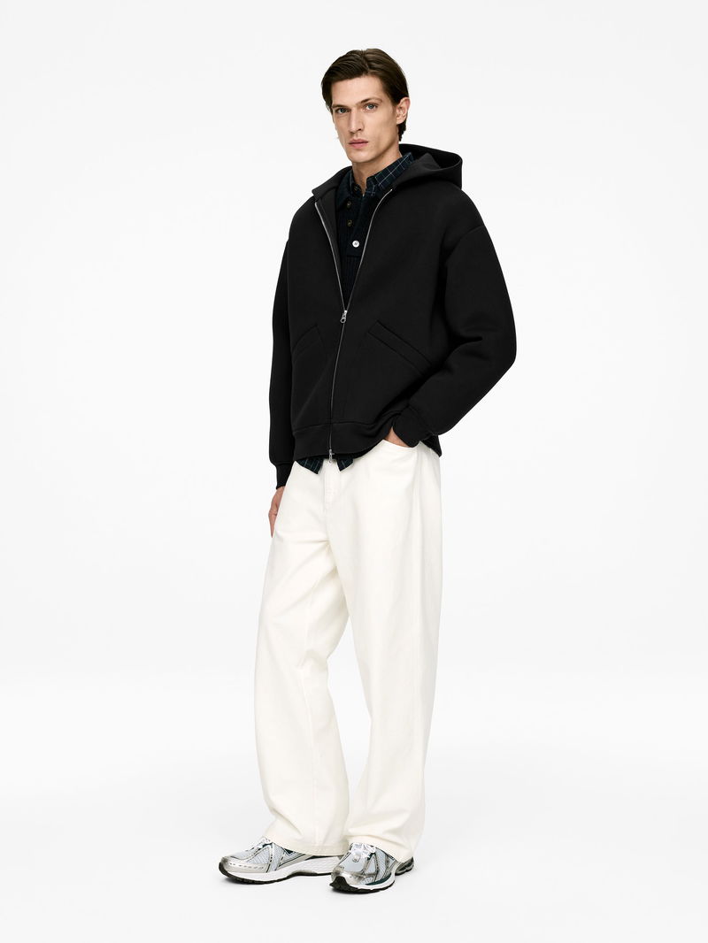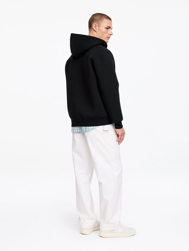 Zipped hoodie sewn from a stretchy scuba fabric. Featuring slanted welt pockets, ribbed cuffs and hem, and a shell fabric hood. Finished with clean detailing and cut in a relaxed fit.