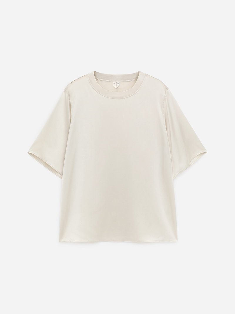 Timeless in design, this silk satin T-shirt is defined by its fluid drape and subtle sheen. Cut with softly dropped shoulders, it features a knitted rib at the neckline, a vertical seam along the centre back, and side seam slits that allow for ease of movement.