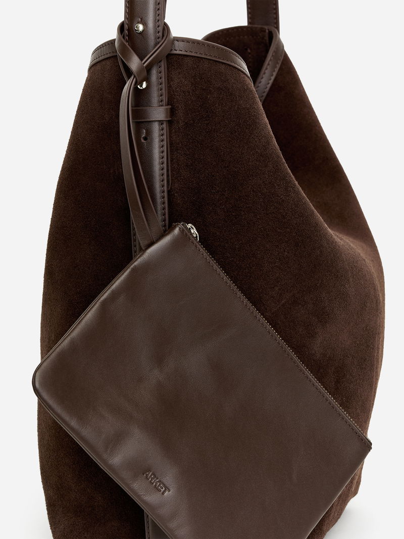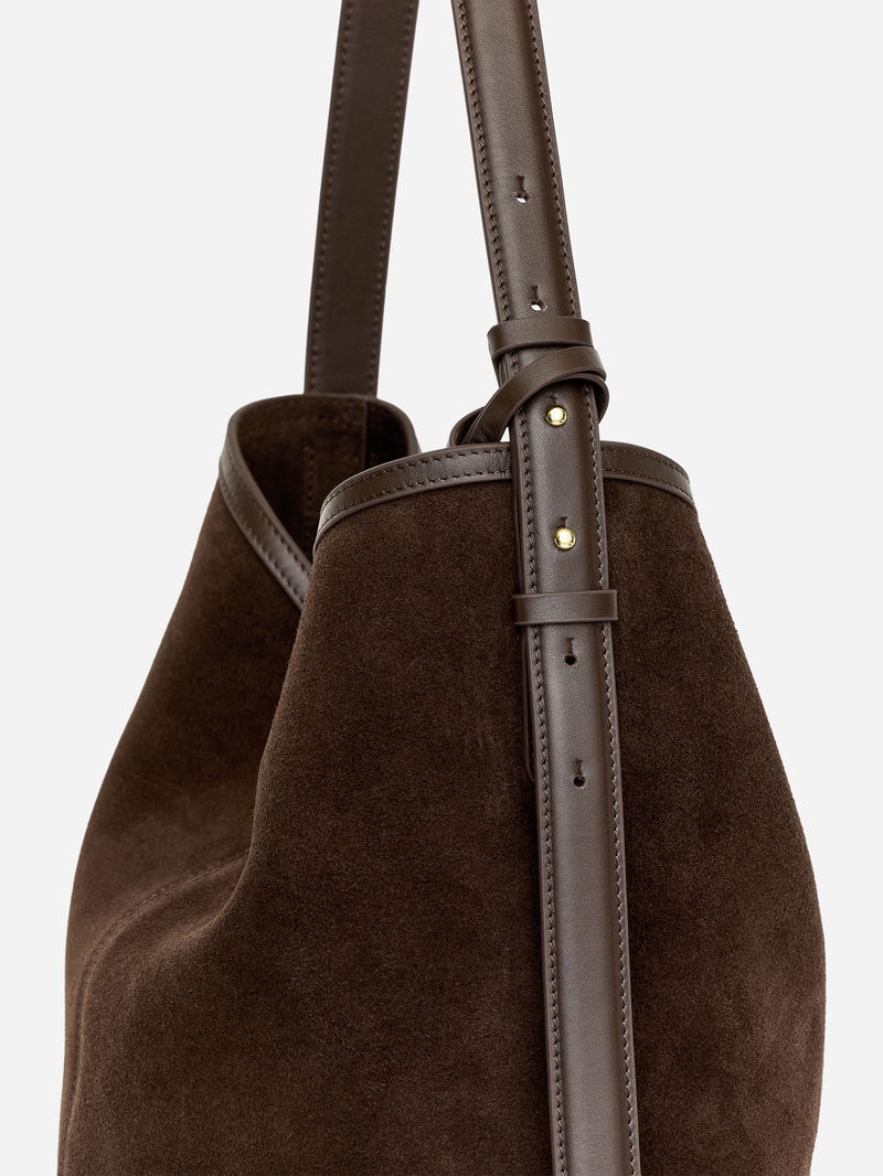 Our curation of women’s bags is crafted with a focus on timeless form, function and considered detailing. This bucket tote in suede features contrast leather bindings and a detachable internal wristlet pouch with zip. Gold-toned hardware.