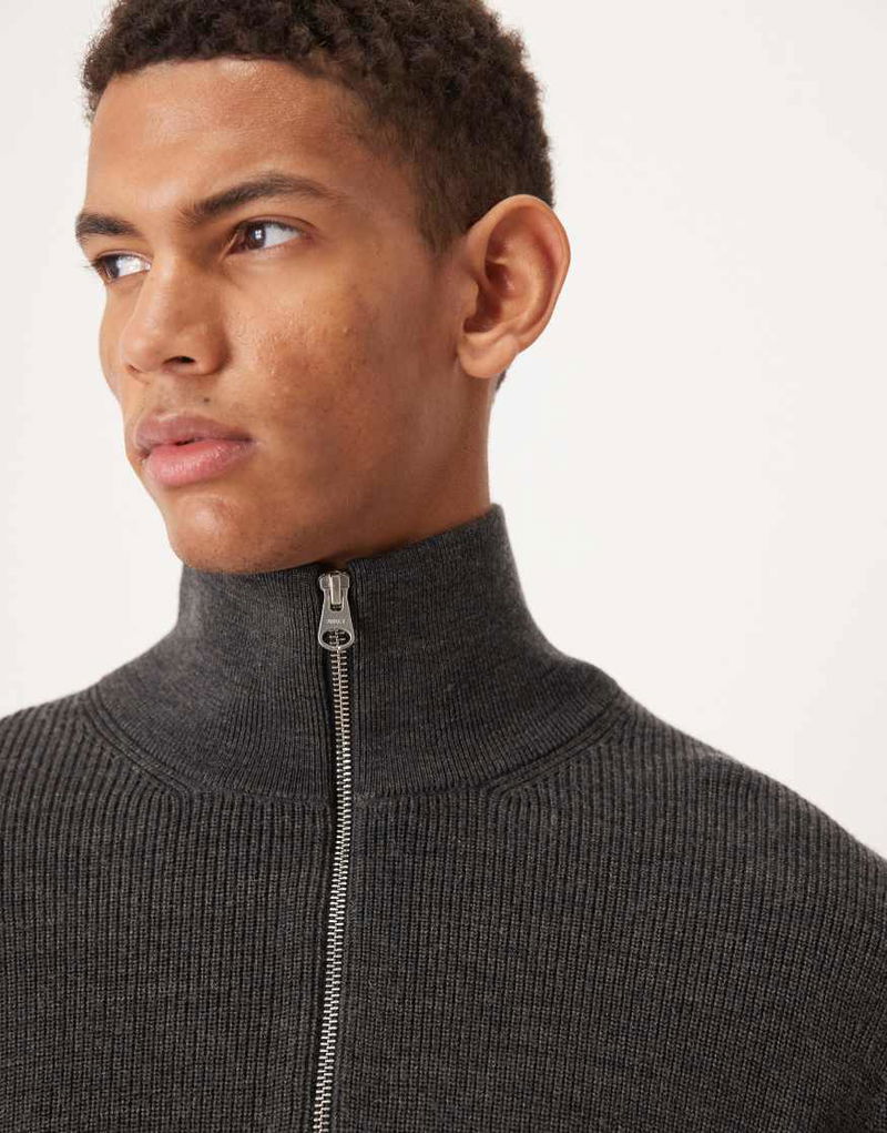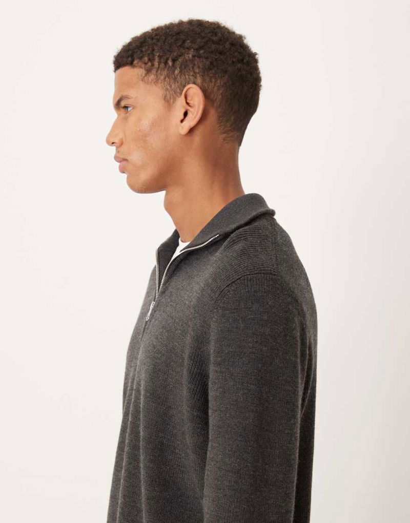Wool Chunky Rib Jumper With Half Zip Funnel Neck In Dark Grey Melange