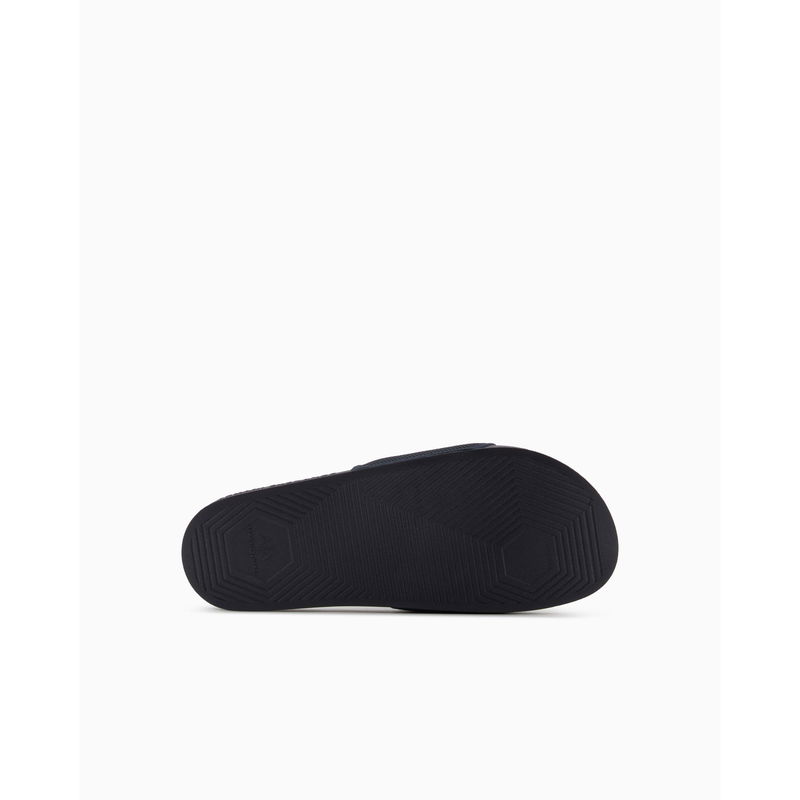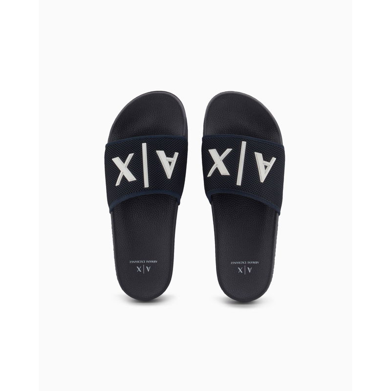 The Armani Exchange AX Logo Slider features a moulded sole unit with a single-strap design for poolside wear.