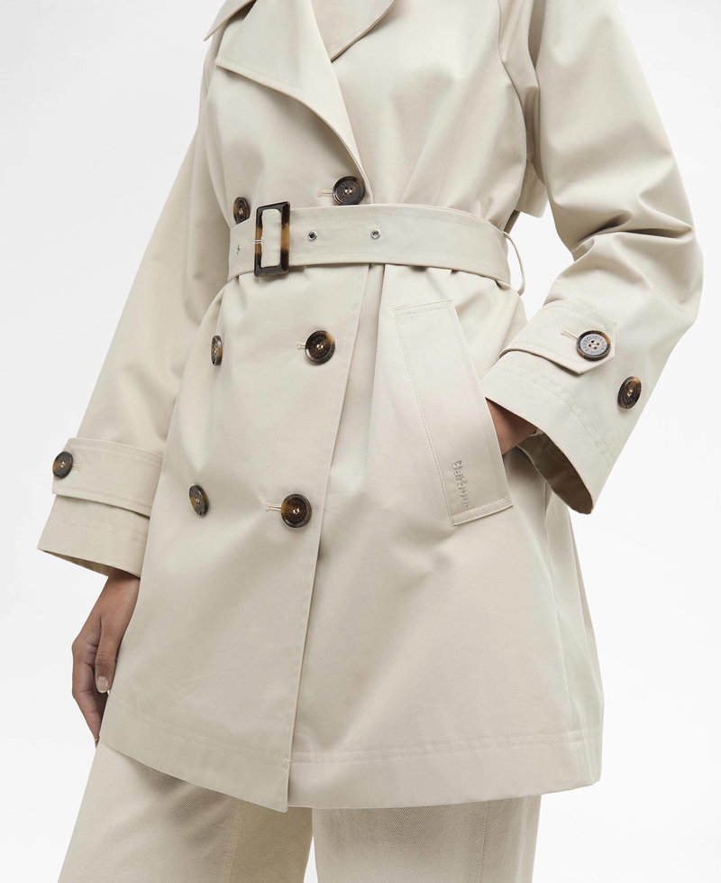 A true wardrobe classic, the Barbour Adare Showerproof Trench Coat redefines timeless elegance with modern functionality. Its shorter-length, double-breasted silhouette is refined with mock horn button trims and cuff tabs, while a self-fabric waist belt with mock horn buckle ensures a tailored, flattering fit.