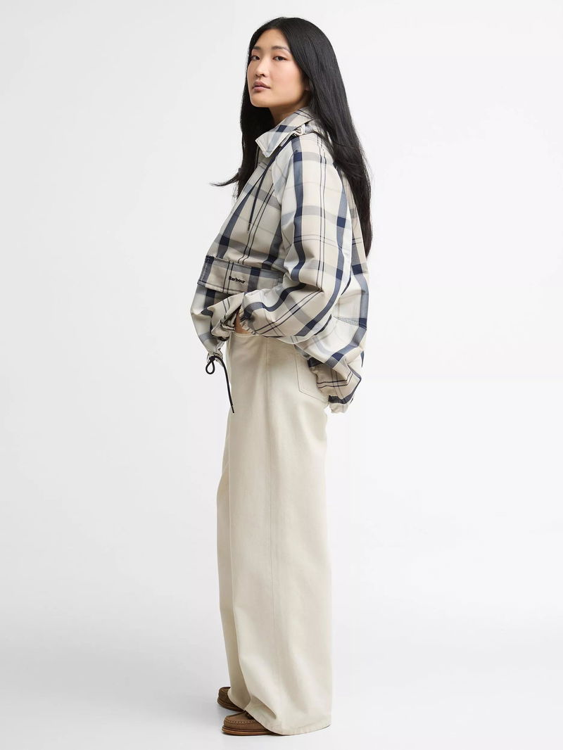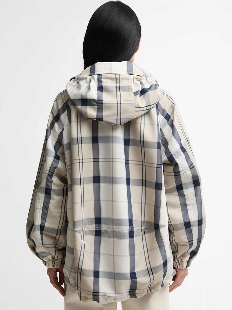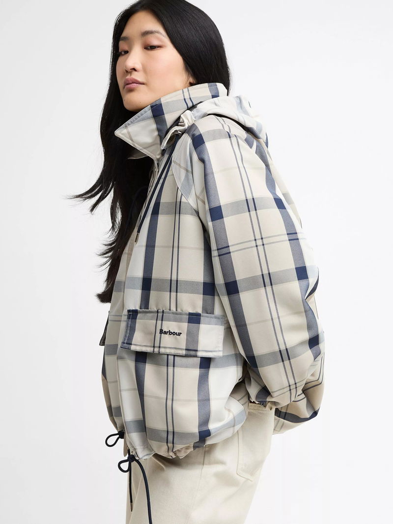 The Barbour Ballina Check Showerproof Jacket combines contemporary design with signature practicality. Cut to an oversized silhouette, it features a bold check pattern, detachable hood, and functional flap pockets.