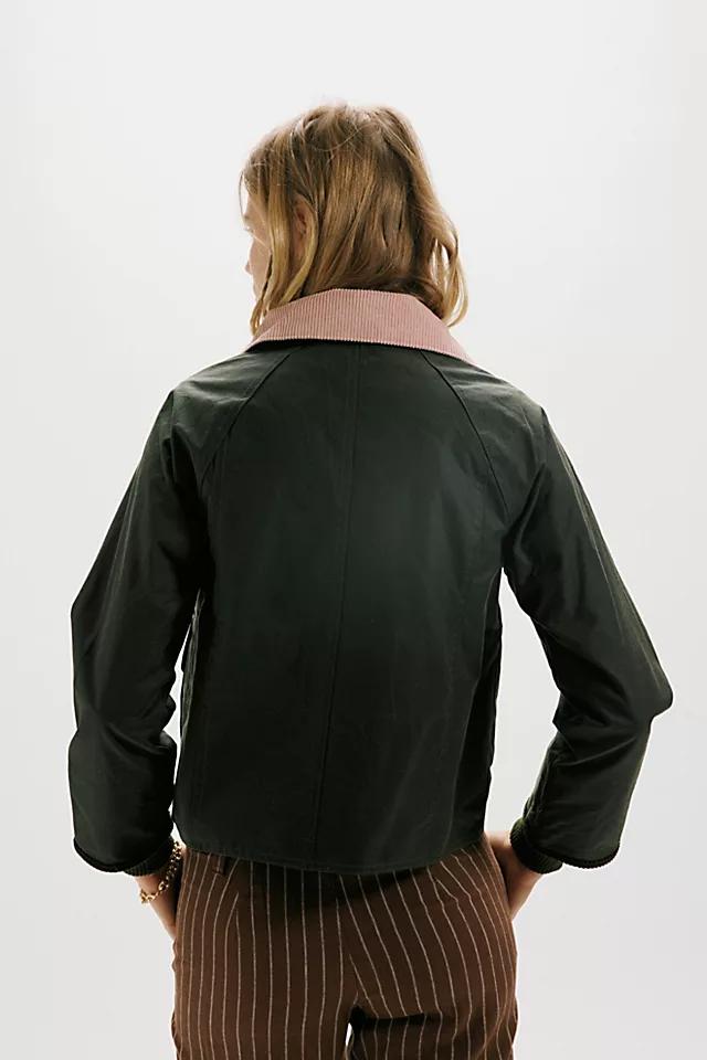 Barbour’s signature silhouette with a contemporary twist, featuring a cropped, tailored silhouette, crafted in a classic, waxed cotton fabrication, and designed with a contrasting corduroy collar.
