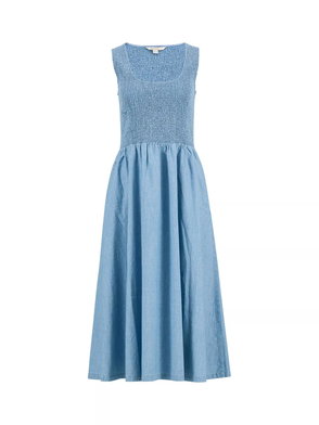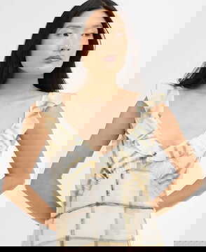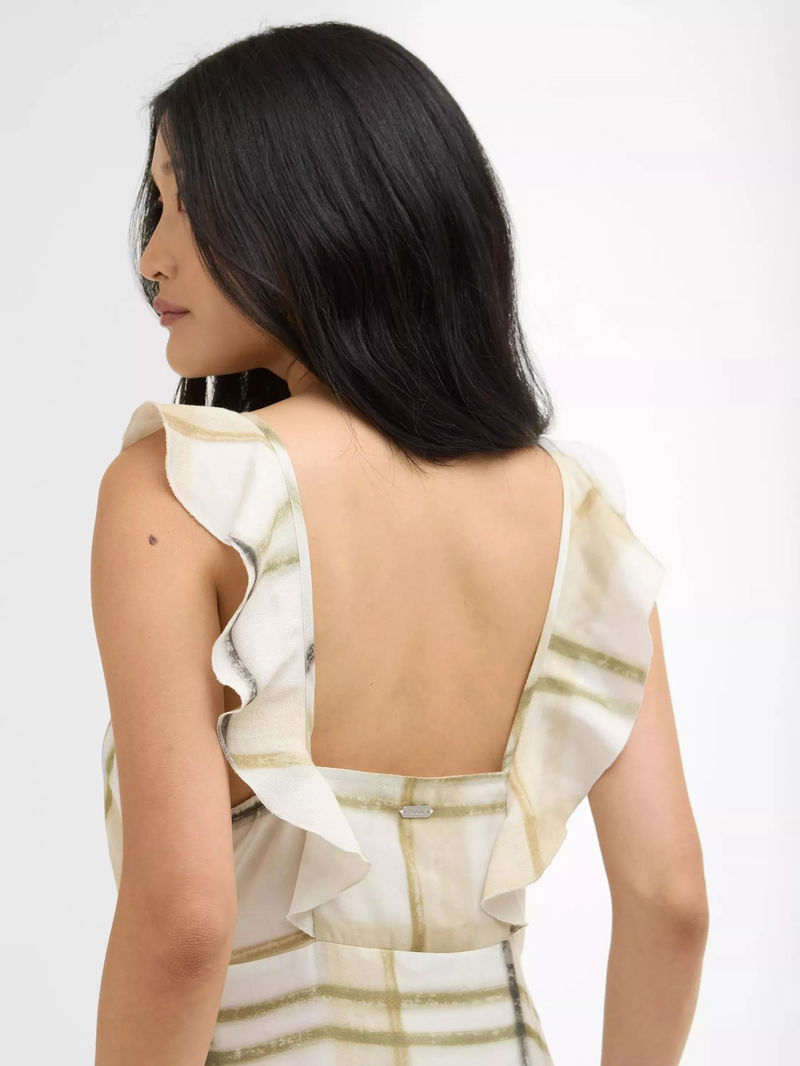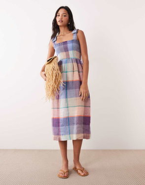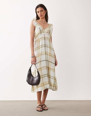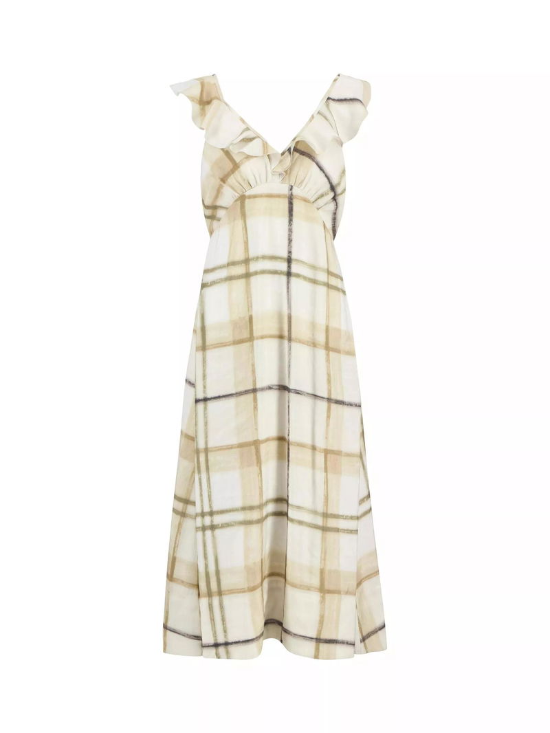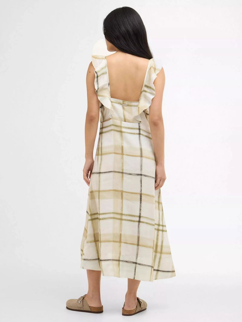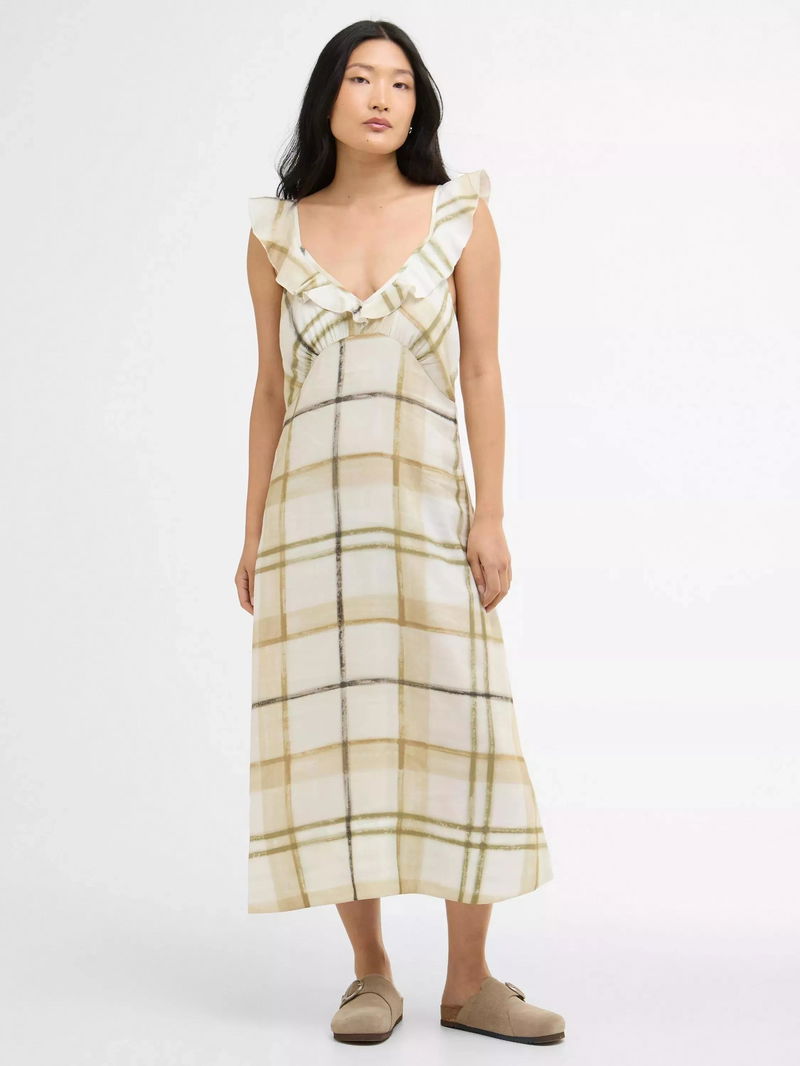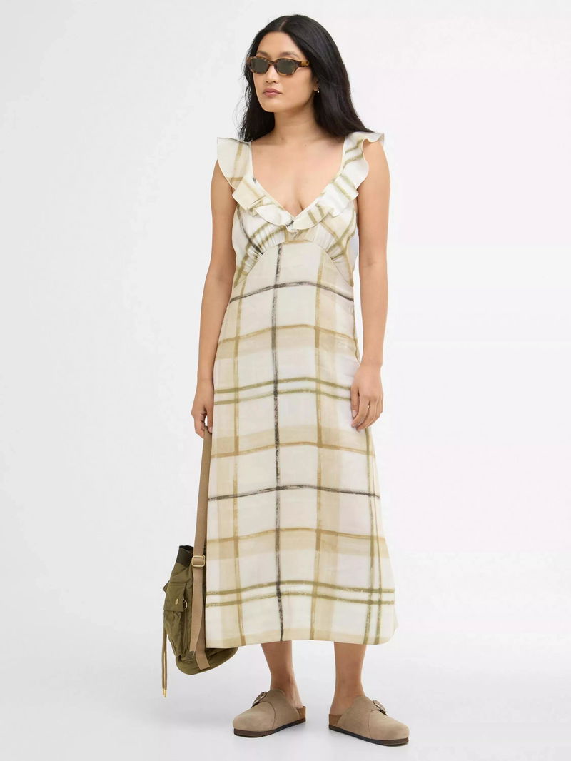 The Barbour Gianna Tartan Midi Dress exudes effortless femininity with a relaxed, flowing silhouette and soft ruffle detailing at the armholes.