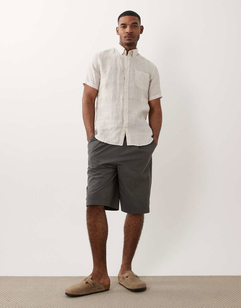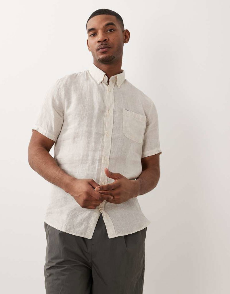 Linton Short Sleeve Linen Tailored Logo Shirt In Beige