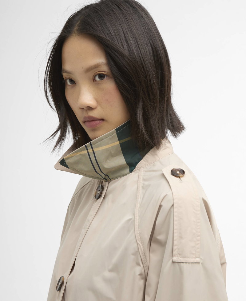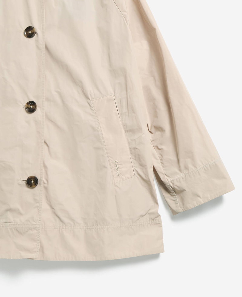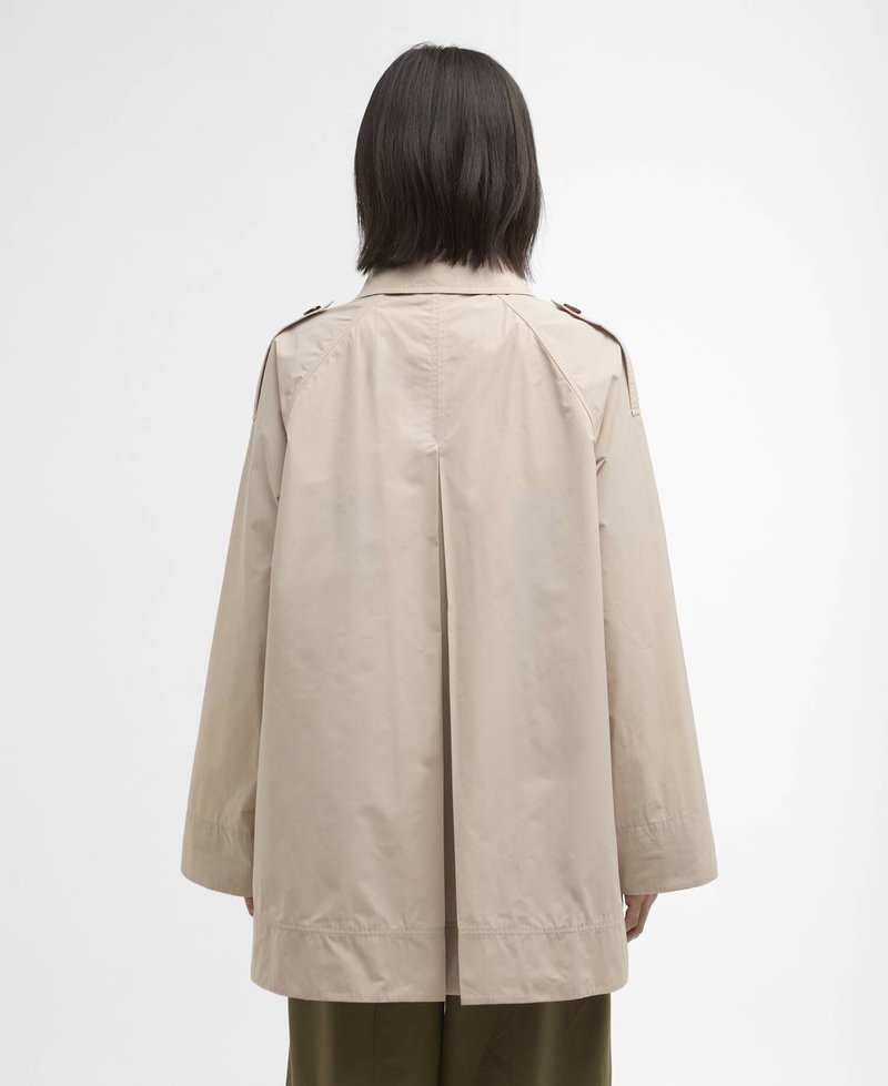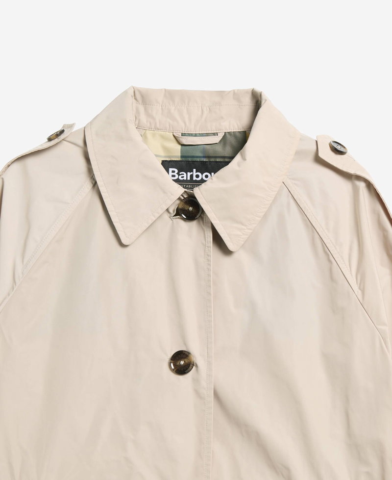 The Barbour Maggie Showerproof Mac is a mid-length, lightweight coat designed to keep you stylish and dry. This showerproof mac features classic details like epaulettes, mock horn buttons, welt pockets, and a deep inverted back pleat for a sophisticated silhouette.