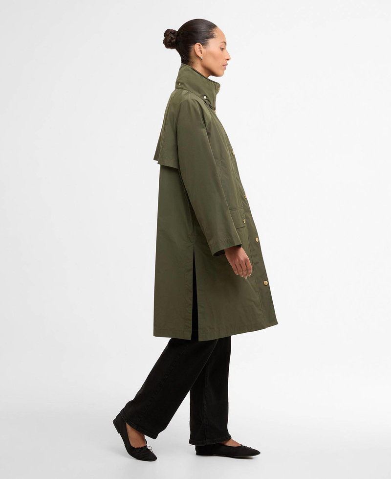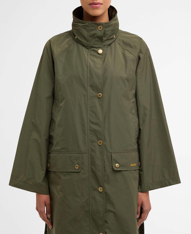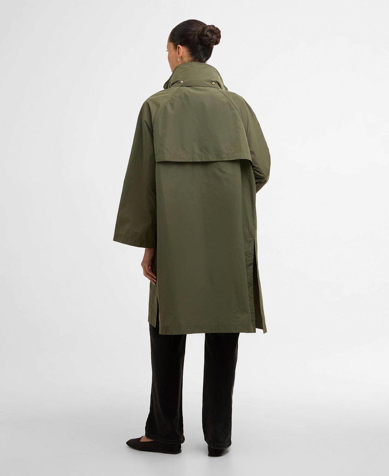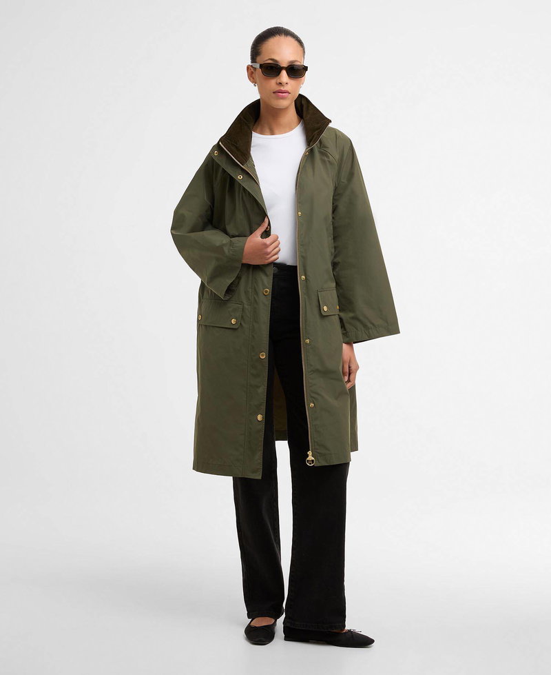 Its longline shape offers a flattering, versatile fit, while the rollaway hood tucked into the funnel collar provides effortless adaptability. With four handy pockets, deep side splits for movement, and bright brass trims, it’s finished with a tartan buggy lining for that unmistakable Barbour charm.