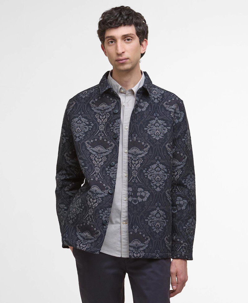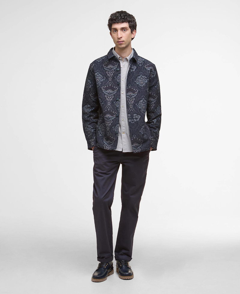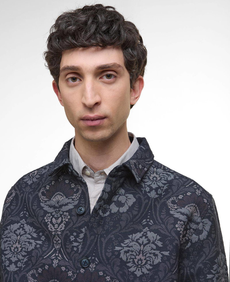 Button through overshirt featuring side entry welt pockets in a botanical jacquard.
