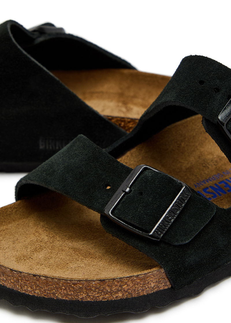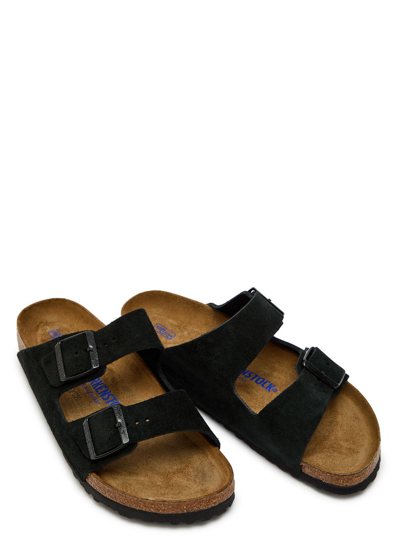 Birkenstock suede sliders. Adjustable buckle-fastening straps, debossed logo at side, designer-engraved hardware, contoured footbed, cork midsole, EVA rubber sole, open round toe.