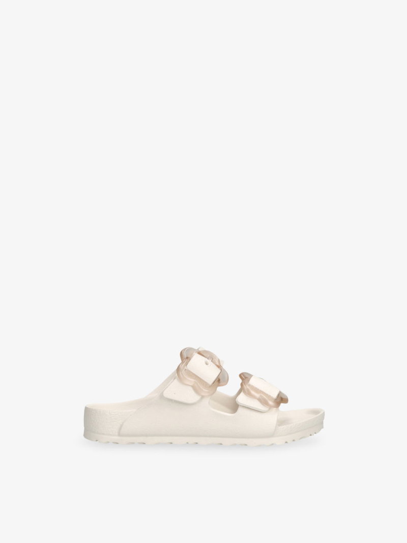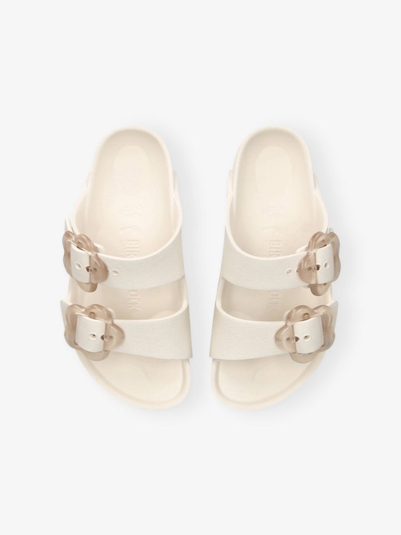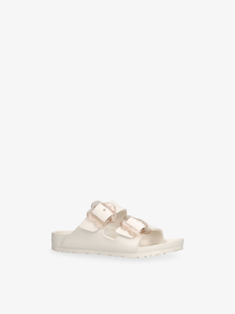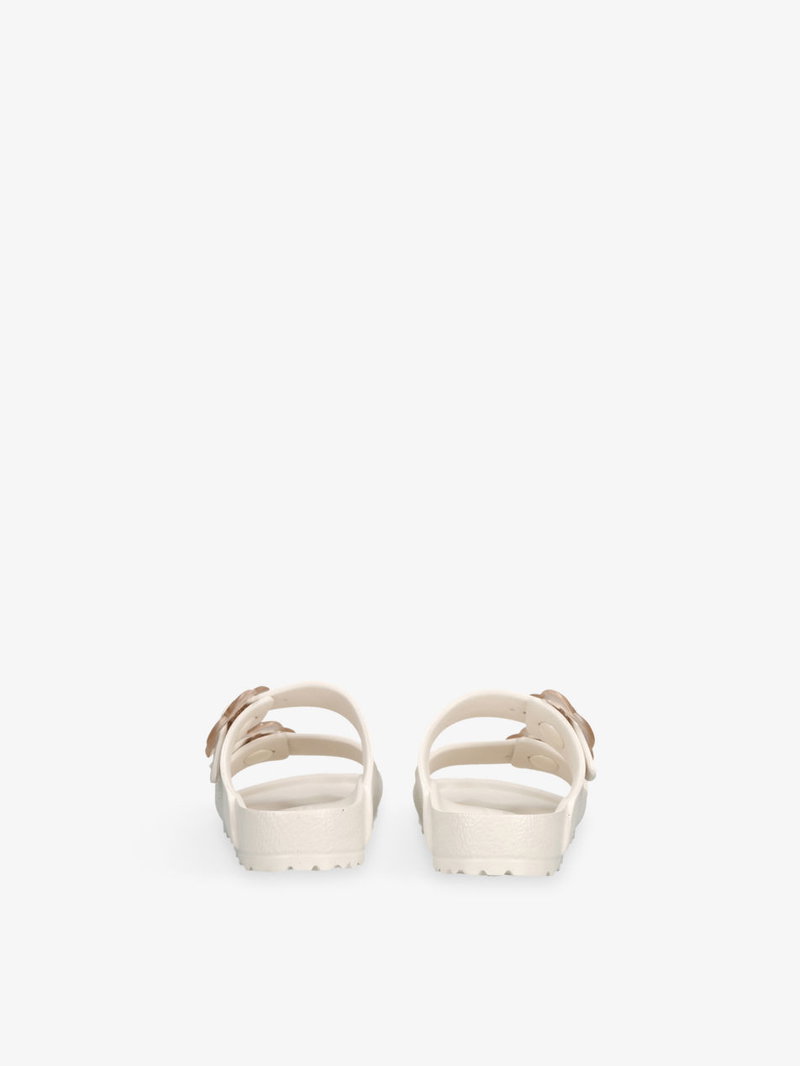 Round open toe, two straps, branded hardware, signature moulded EVA sole.