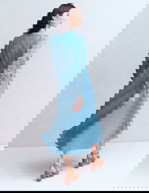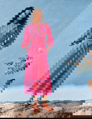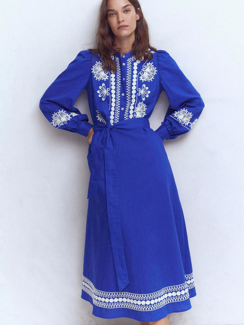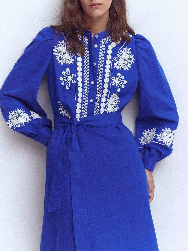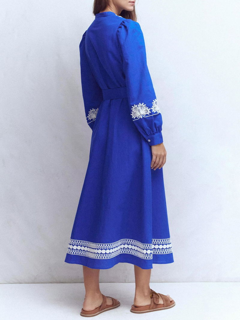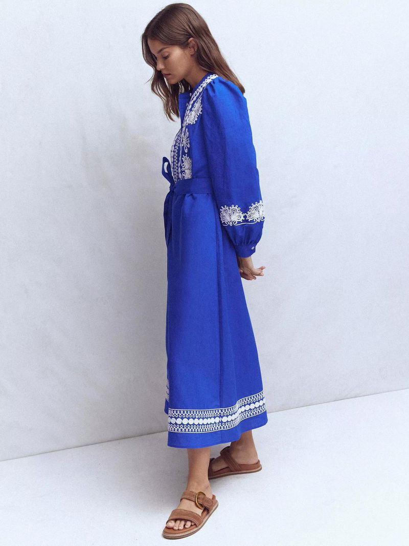 Ava Embroidered Linen Rich Midi Dress, Blue/Multi