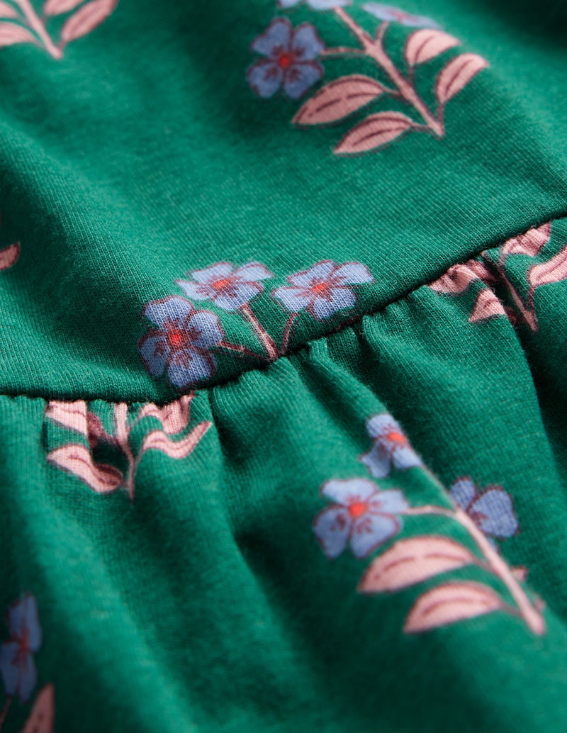 Curved Yoke Jersey Dress-Jewel Green Flower Stamp