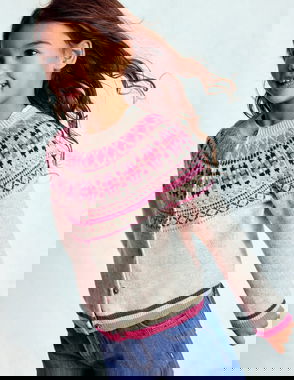 Fair Isle – but not as you know it. Bold stripes, playful motifs, and contrasting hues make this cotton-blend cardigan stand out.