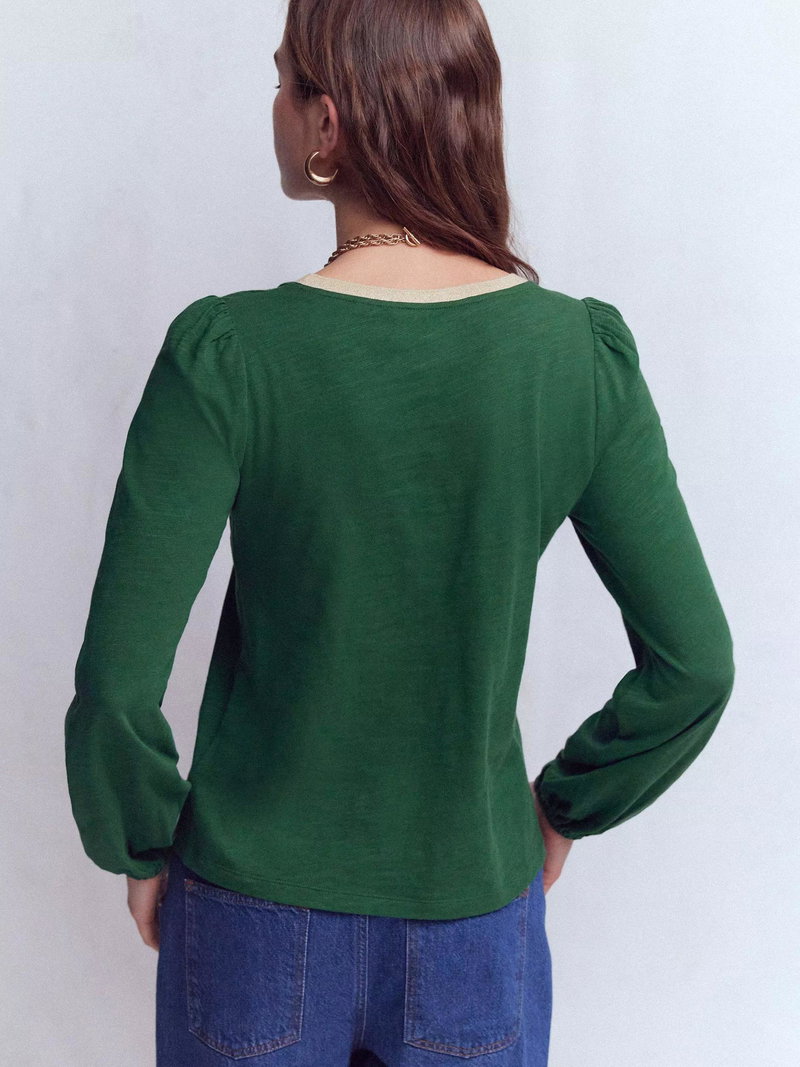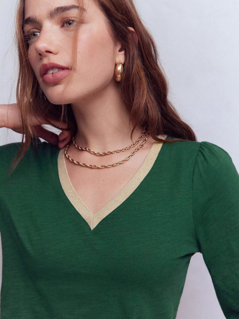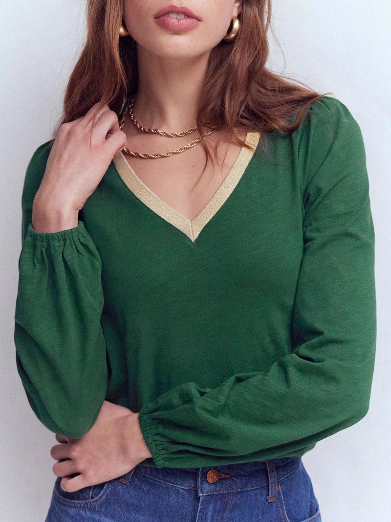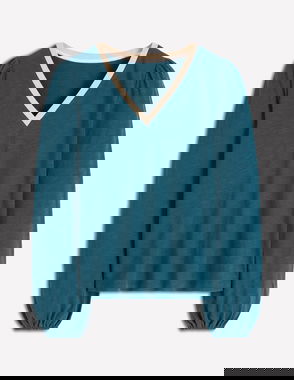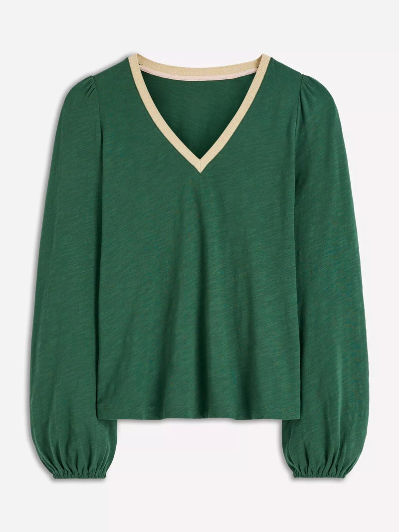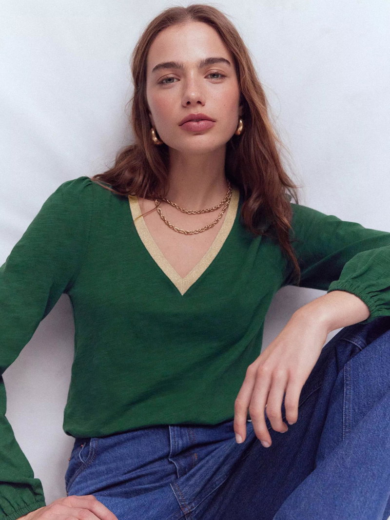 How to elevate a basic cotton top into something really special? Boden have added fuller sleeves and a V-neck with metallic trim. Wear with jeans as a weekend pub top or dress up with a skirt for date night.