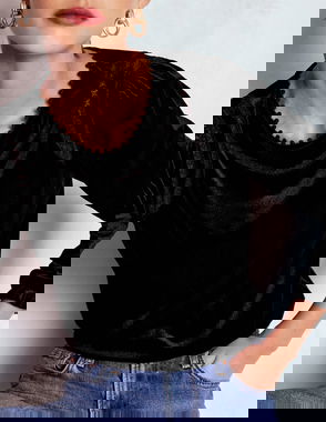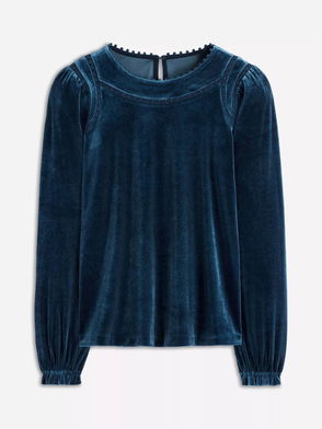 Our Mila top is all about the details. (Pom-pom trims to be precise.) It also has lovely blouson sleeves and slightly puffed shoulders.