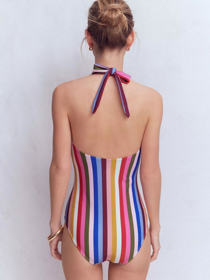Enhanced with a ruched front panel that ties at the back, this halterneck swimsuit will flatter your frame. The powermesh lining creates a sculpted finish while fixed cups add further support.
