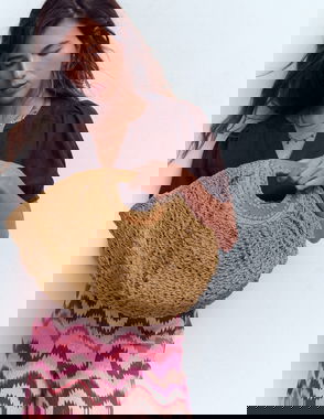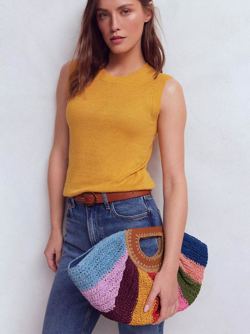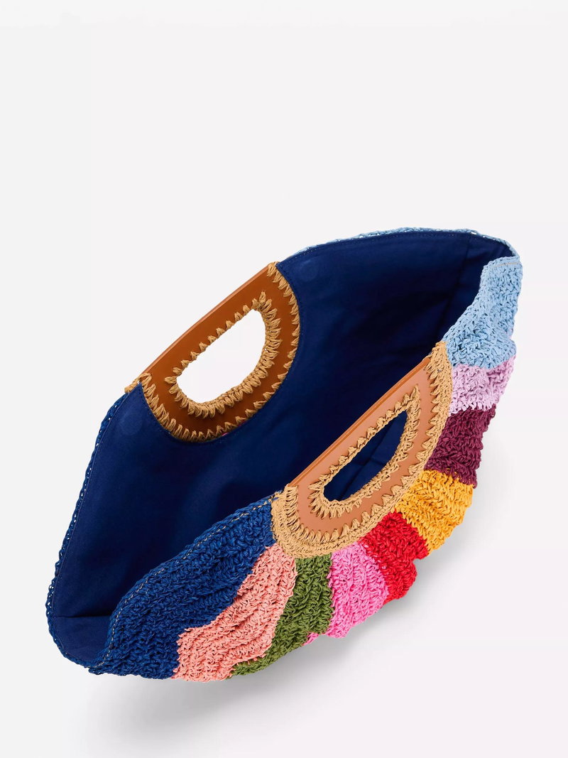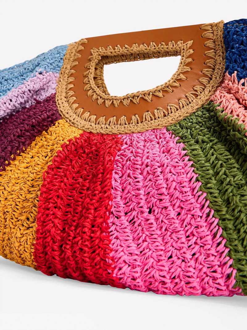 No beach escape is complete without a colourful raffia bag. This statement half moon clutch is best accessorised with palm trees and a pina colada. And that's an order.