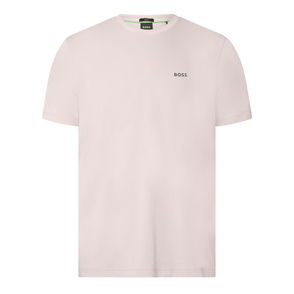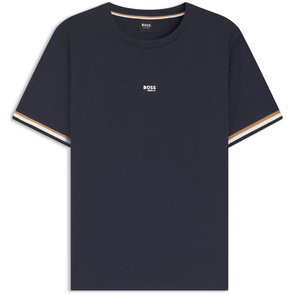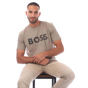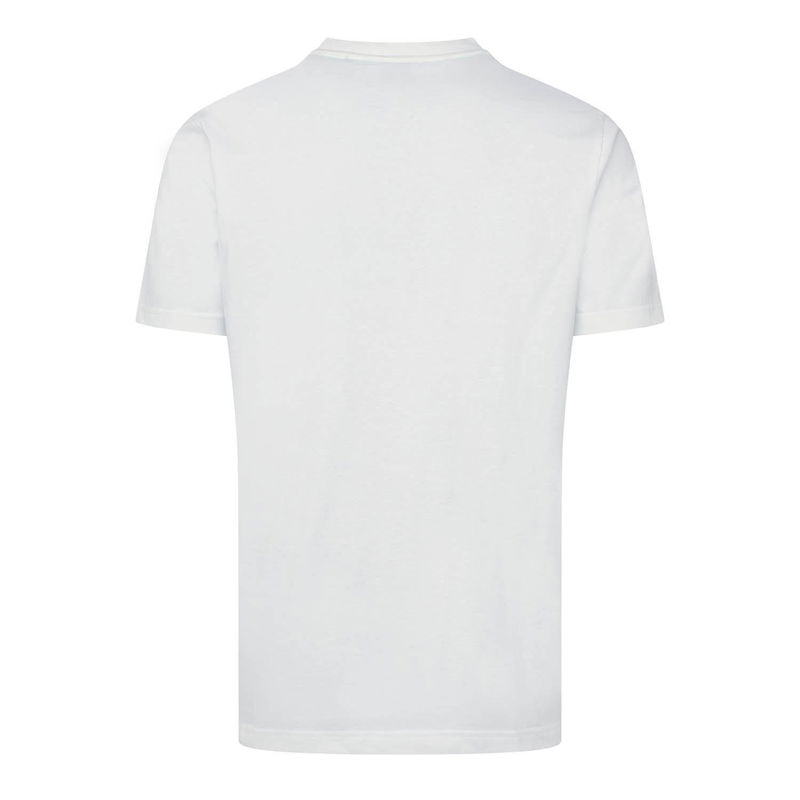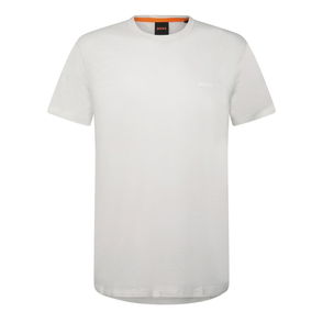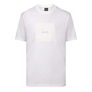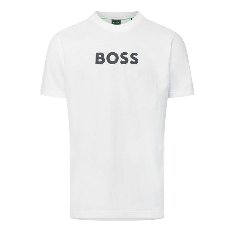 Mens Boss Logo T- Shirt in white. Ribbed crewneck. Short sleeves. Signature BOSS logo is printed on the chest in black. Top stitching.