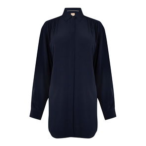 This fashion blouse showcases clean lines with a structured shape. The long sleeve design incorporates volume at the arms while maintaining a sleek bodice for balanced form.