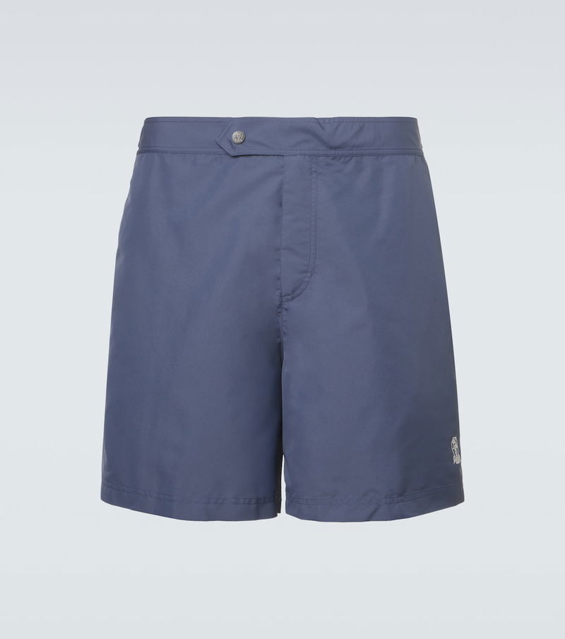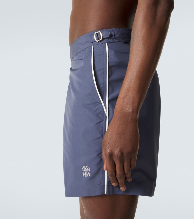 Bring sophistication to the beach with these straight-fit swim trunks from Brunello Cucinelli. The design features built-in mesh briefs, an adjustable waist, a zipper fly with snap button closure, and the signature logo on one leg.