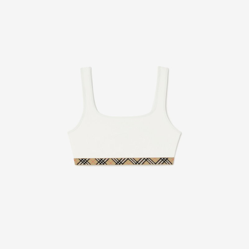 A square-neck bikini top in stretch nylon, edged with a Burberry Check elasticated tape in signature sand beige. The sporty, figure-sculpting silhouette comes with a matching drawstring bag.