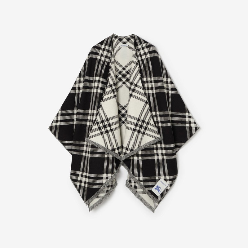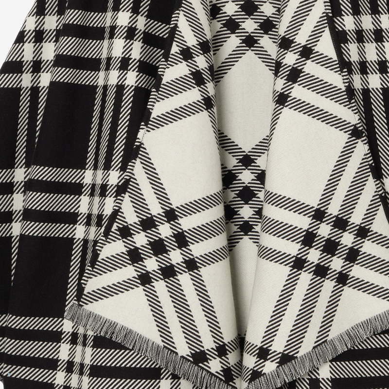 A cape crafted in Italy from an ultra-soft blend of wool, silk and cashmere. Ideal for between-the-seasons, the lightweight style is jacquard-woven with a black and calico beige check.