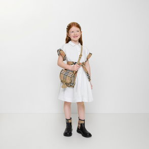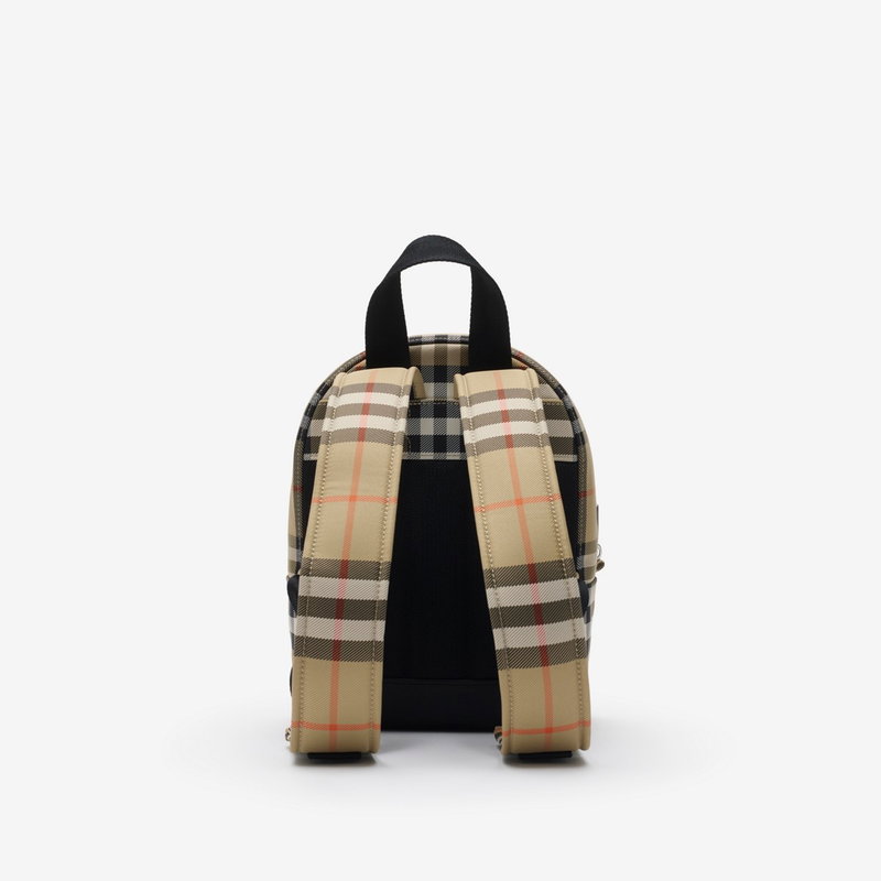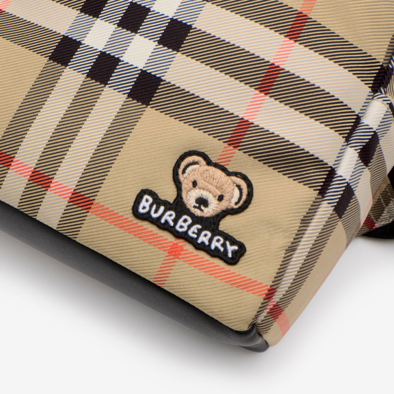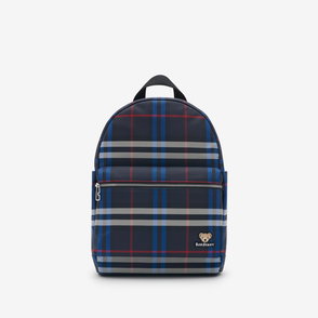 A compact backpack made from nylon woven with the Burberry Check and lined in a solid colour. The style has a leather base and is appliquéd with an embroidered Thomas Bear and our logo. Closes with a zip pull in the shape of the signature B.