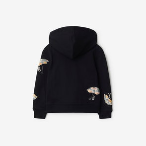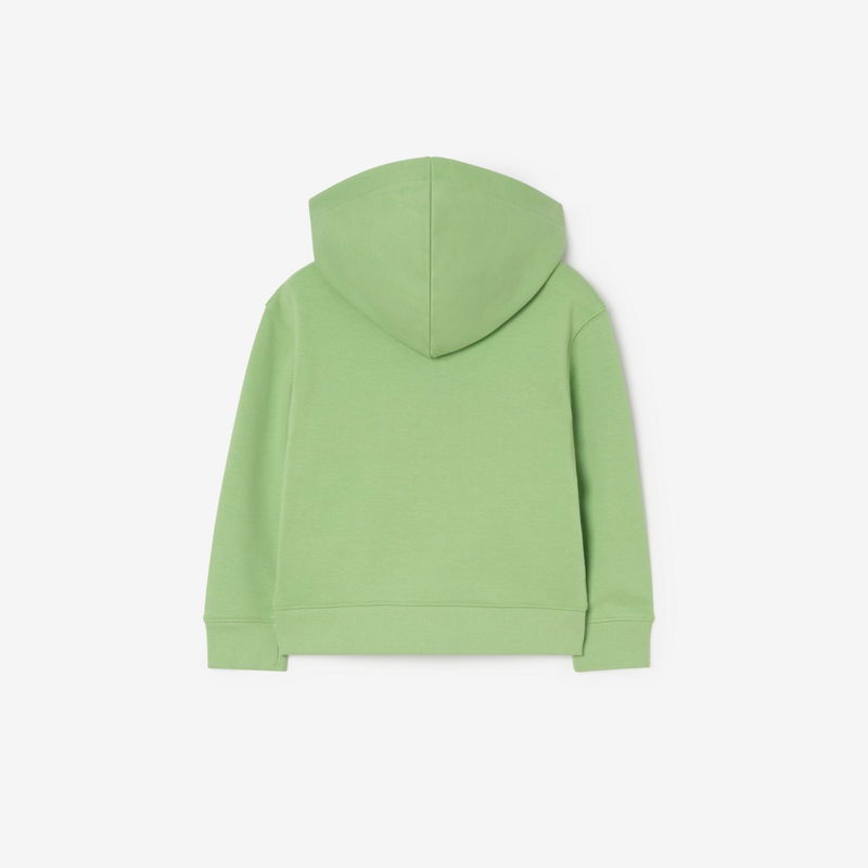 A zip hoodie made from loop-back cotton in summery honeydew green. The design features appliquéd labels depicting our logo and the classic British seaside dish of fish and chips.