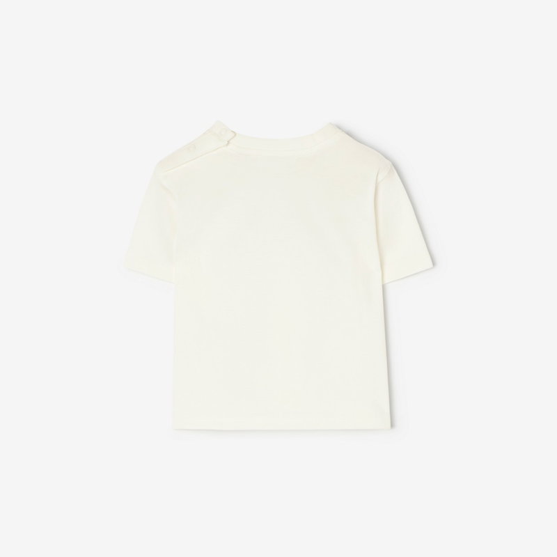 A cotton jersey T-shirt featuring a playful print of Thomas Bear holding a Burberry Check flag, accompanied by his friend as they make their way to a tea party.