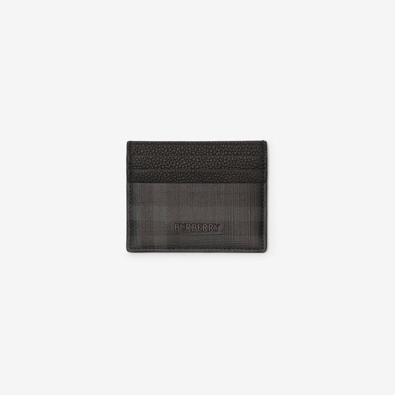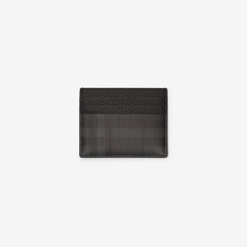 A card case made from coated canvas, printed with the Burberry Check in iron grey. The design is trimmed with grainy calf leather.