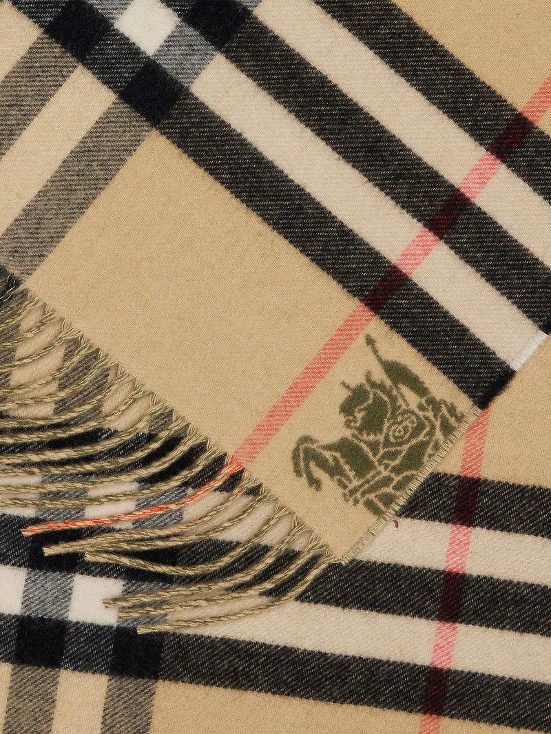 Burberry cashmere scarf. Check pattern, fringed trims, brushed texture, logo patch.