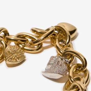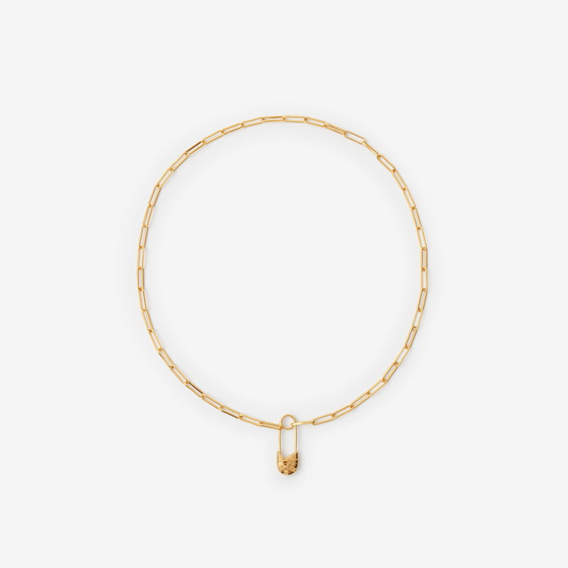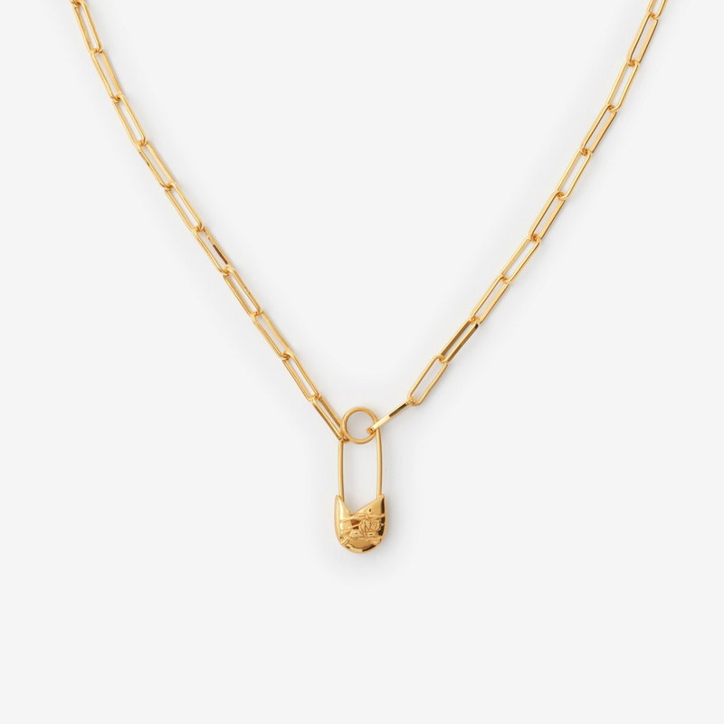 A chain-link necklace made in Italy from brass with gold plating. The elegant style is defined by a safety pin clasp moulded with our Equestrian Knight Design.