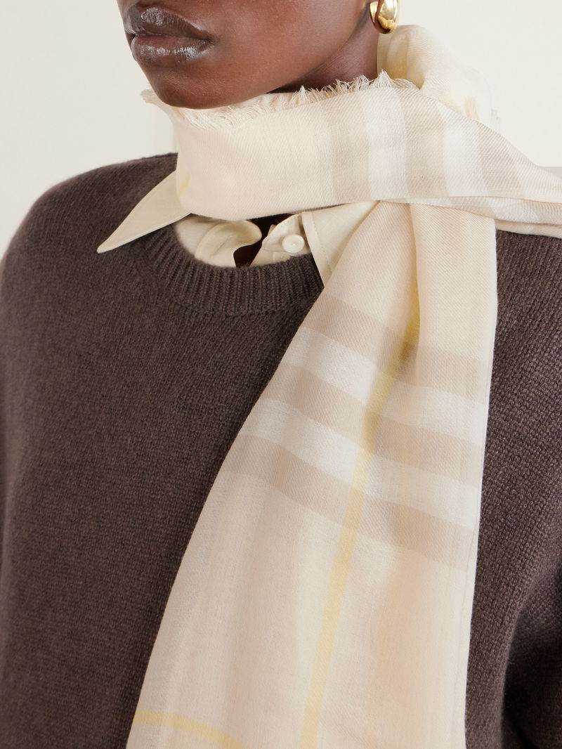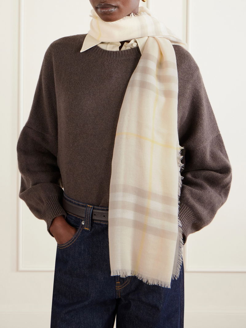 Burberry's scarf is emblazoned with a scaled-up version of the house's signature checks. It's been made in Italy from lightweight wool and has an enveloping shape with tactile frayed edges. The soft palette will go with almost everything.