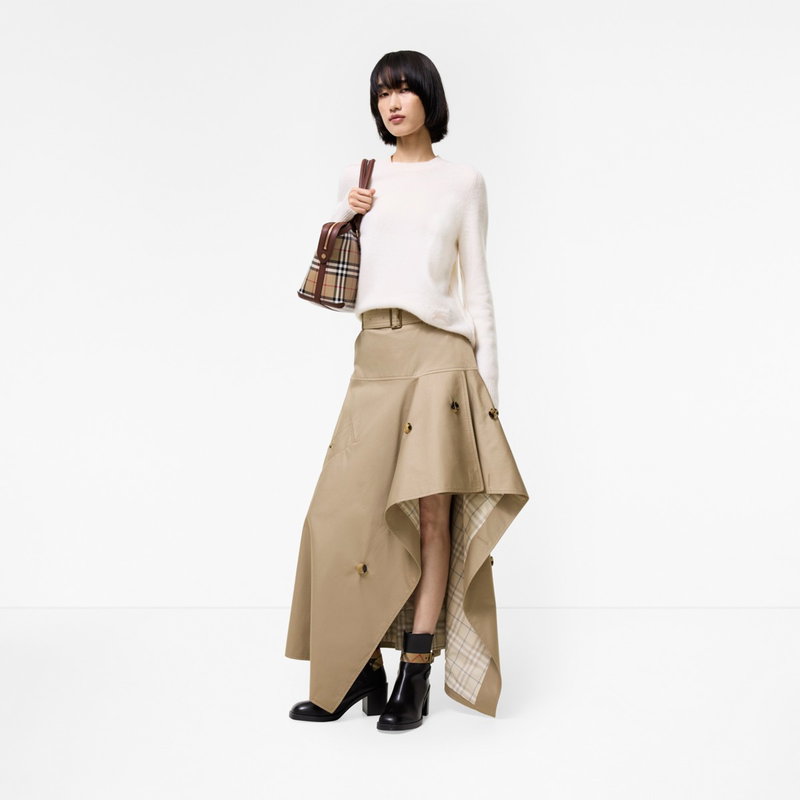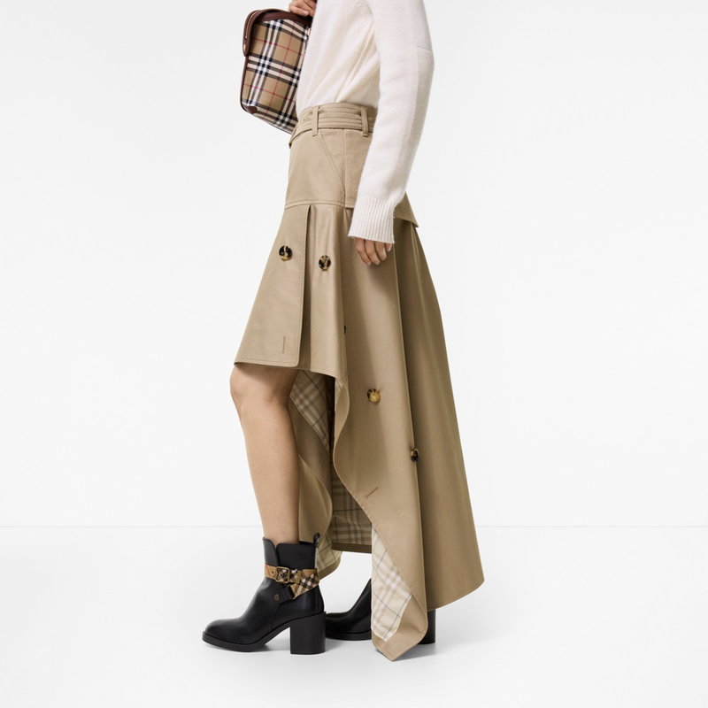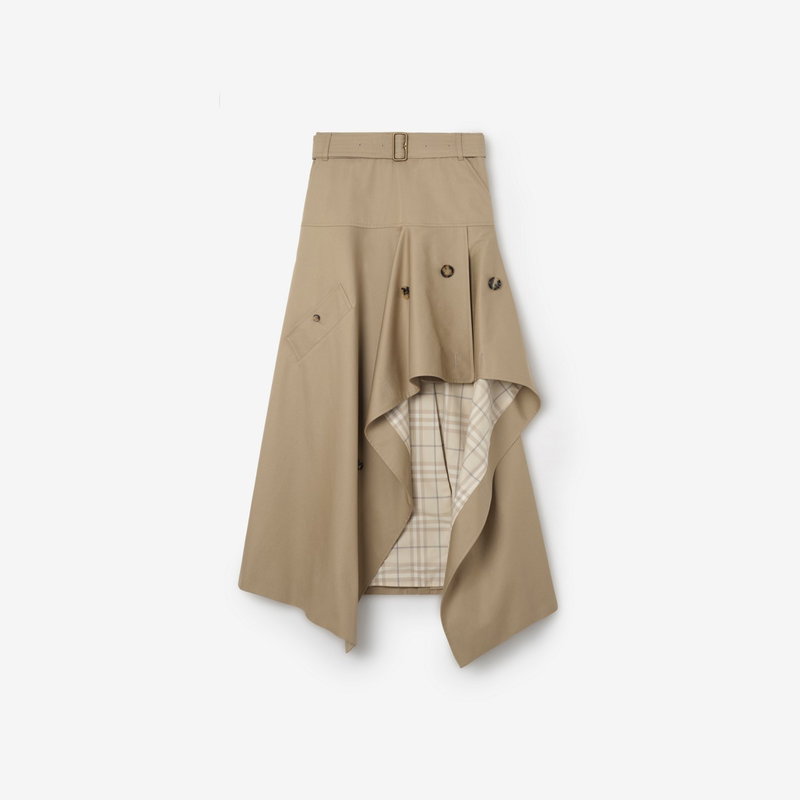 The iconic trench coat is reimagined as a bold midi skirt in signature cotton gabardine, treated for a soft finish. The fit-and-flare silhouette sits high on the waist, with an asymmetric hemline that reveals the Burberry Check cotton lining in sesame beige. The buckled belt, buttoned front and storm shield at the back draw on details from our Heritage raincoats.